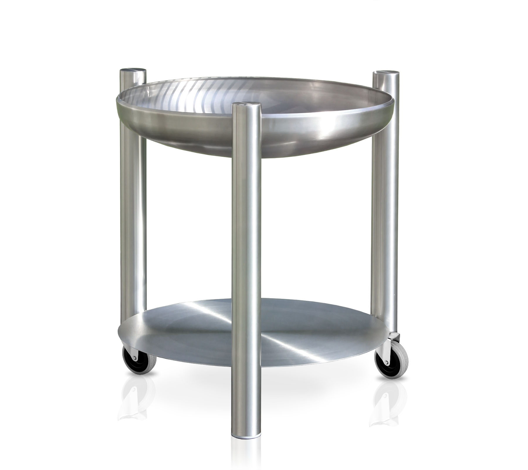 Die Feuerschale besteht vollständig aus rostfreiem Edelstahl und besitzt ein gleichmäßiges Schliffbild. Die drei Rundfüße sind fest mit der Schale verschweißt und sorgen für sicheren Stand, auch auf unebenem Untergrund. Ein Kippeln oder Verrutschen wird verhindert. Die zusätzliche Querverstrebung stabilisiert die langen Standbeine und sorgt für hohe Standfestigkeit. Die Füße sind oben mit Edelstahlkappen verschlossen und unten mit Kunststoffkappen versehen. Optional kann die Feuerschale mit zwei Rädern ausgestattet werden, wodurch der Transport deutlich erleichtert wird.