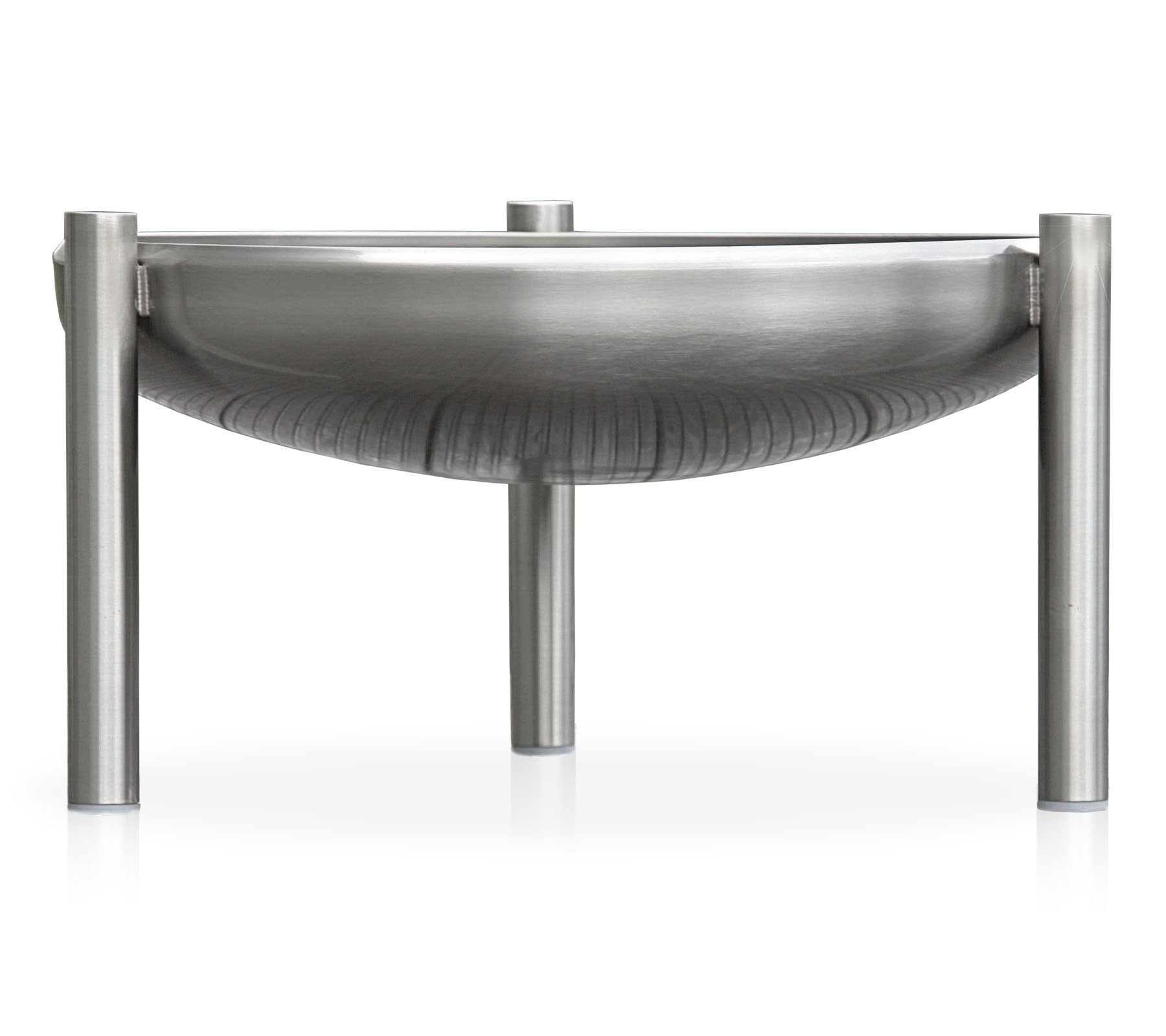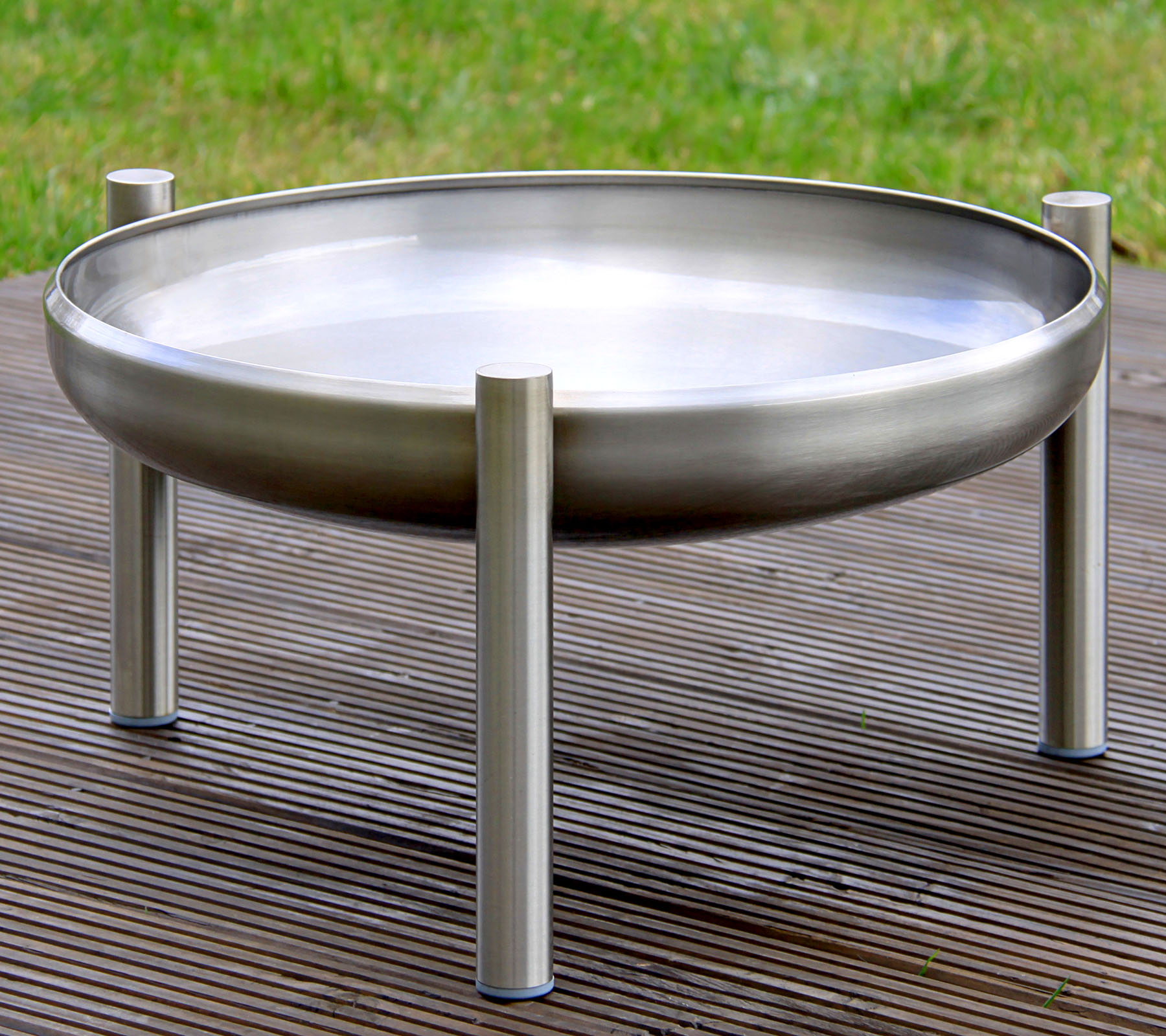 Die Feuerschale besteht vollständig aus rostfreiem Edelstahl und besitzt ein gleichmäßiges Schliffbild. Die drei Rundfüße sind fest mit der Schale verschweißt und sorgen für einen sicheren Stand, auch auf unebenem Untergrund. Ein Kippeln oder Verrutschen wird verhindert. Die Füße sind oben mit Edelstahlkappen verschlossen und unten mit Kunststoffkappen versehen. Standardmäßig ist die Feuerschale mit einer Regenabflussbohrung ausgestattet. Diese kann bei Bedarf mit der mitgelieferten Edelstahlschraube verschlossen werden. Optional kann die Feuerschale durch verlängerte Beine um 20 cm erhöht werden.