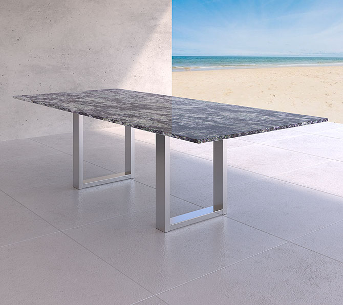 Als formschöner Begleiter auf zwei Kufen aus Metall präsentiert sich der Gartentisch Ulm. Ob rechteckig, mit abgerundeten Ecken, oval oder in organischer Form - der Tisch macht in jeder Ausführung eine ausgezeichnete Figur. Sie alleine bestimmen, wie Ihr Outdoor Tisch aus Naturstein aussehen soll. Jede Tischkonfiguration hat ihren ganz besonderen Charme. Durch die Wahl der perfekten Tischbreite, Tischhöhe und Tischlänge passt sich das Outdoor-Möbelstück Ihren Platzverhältnissen optimal an und fügt sich harmonisch in das Ambiente Ihres Freisitzes ein.