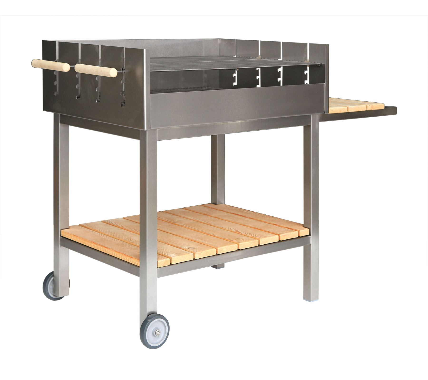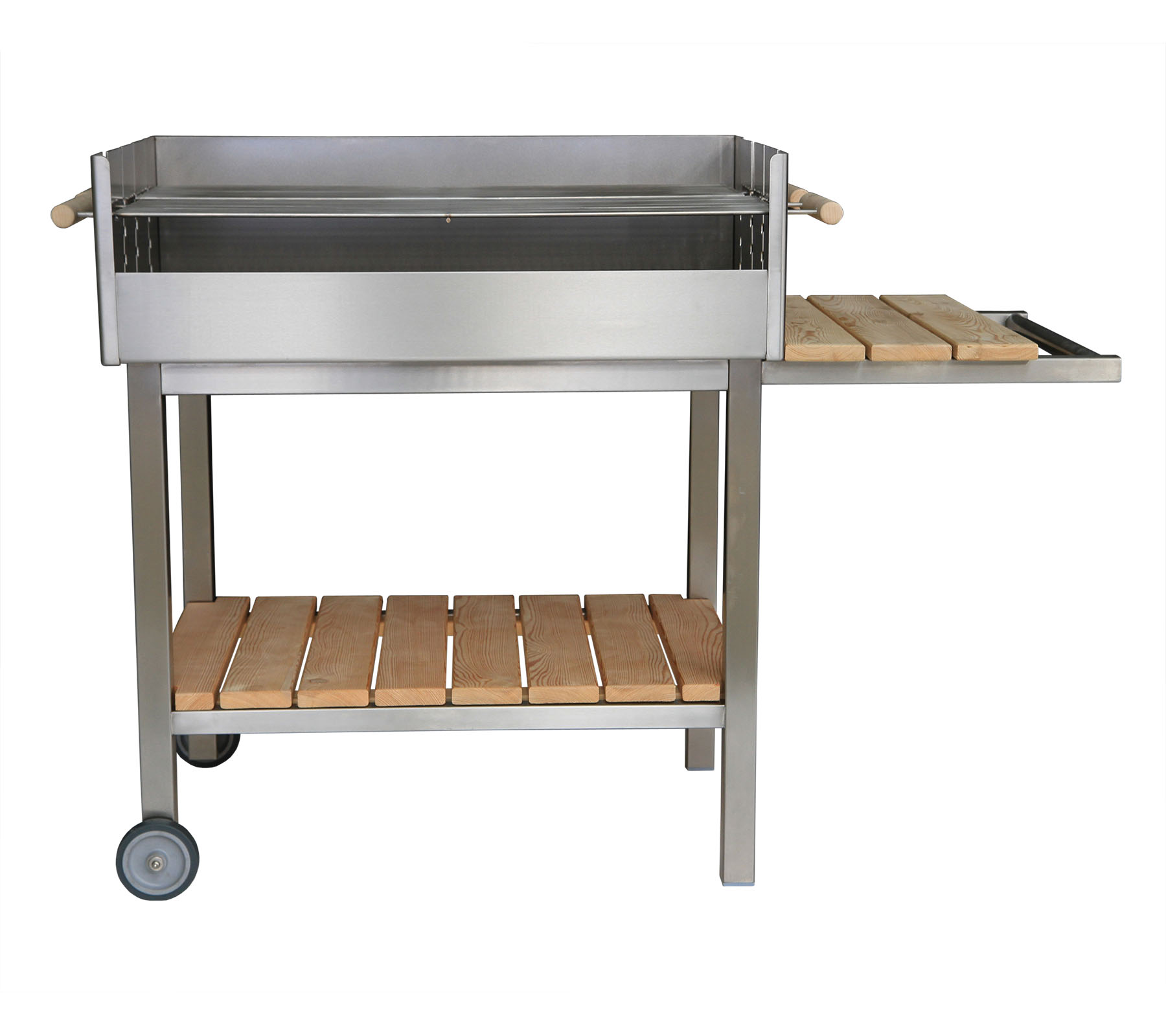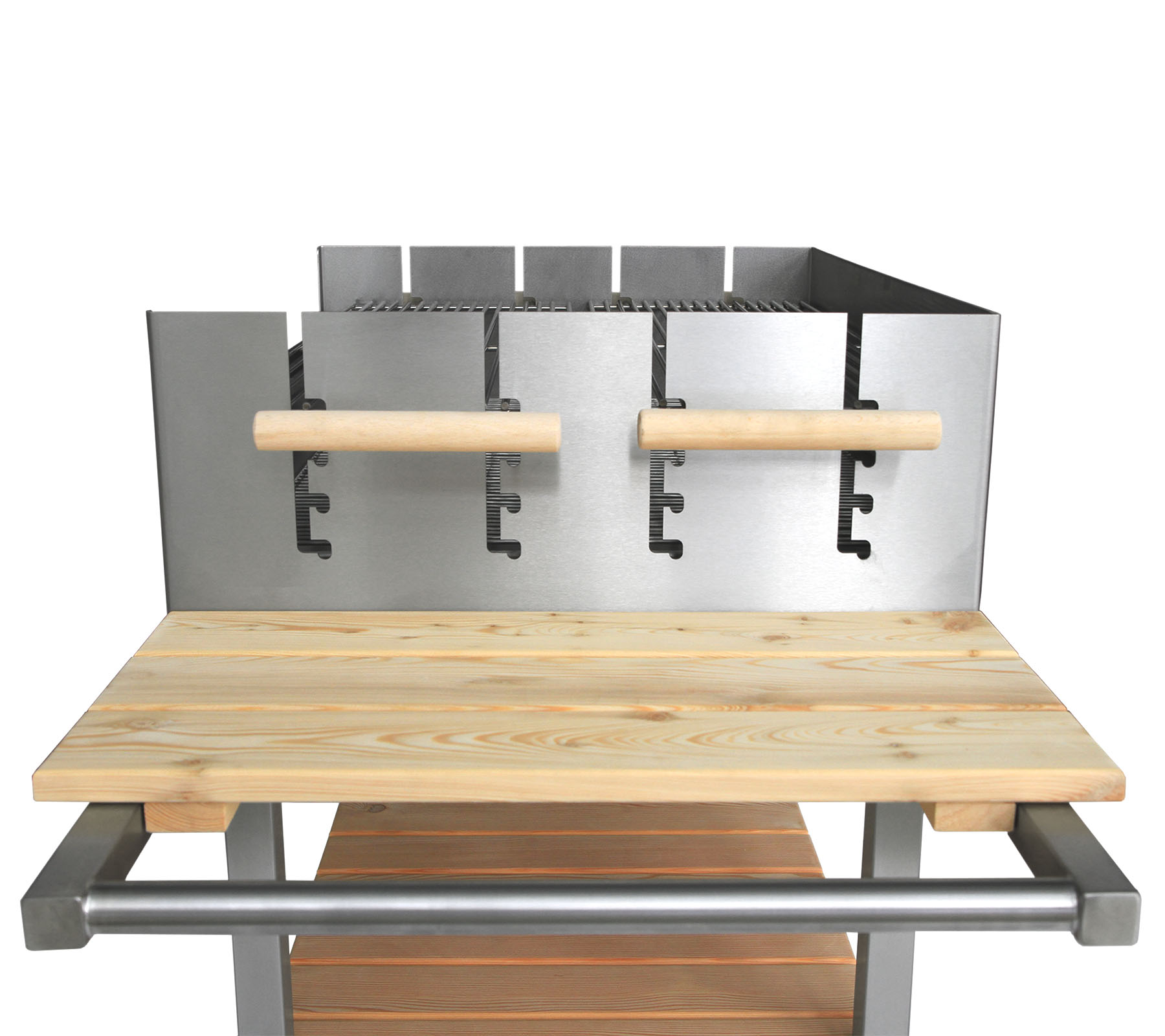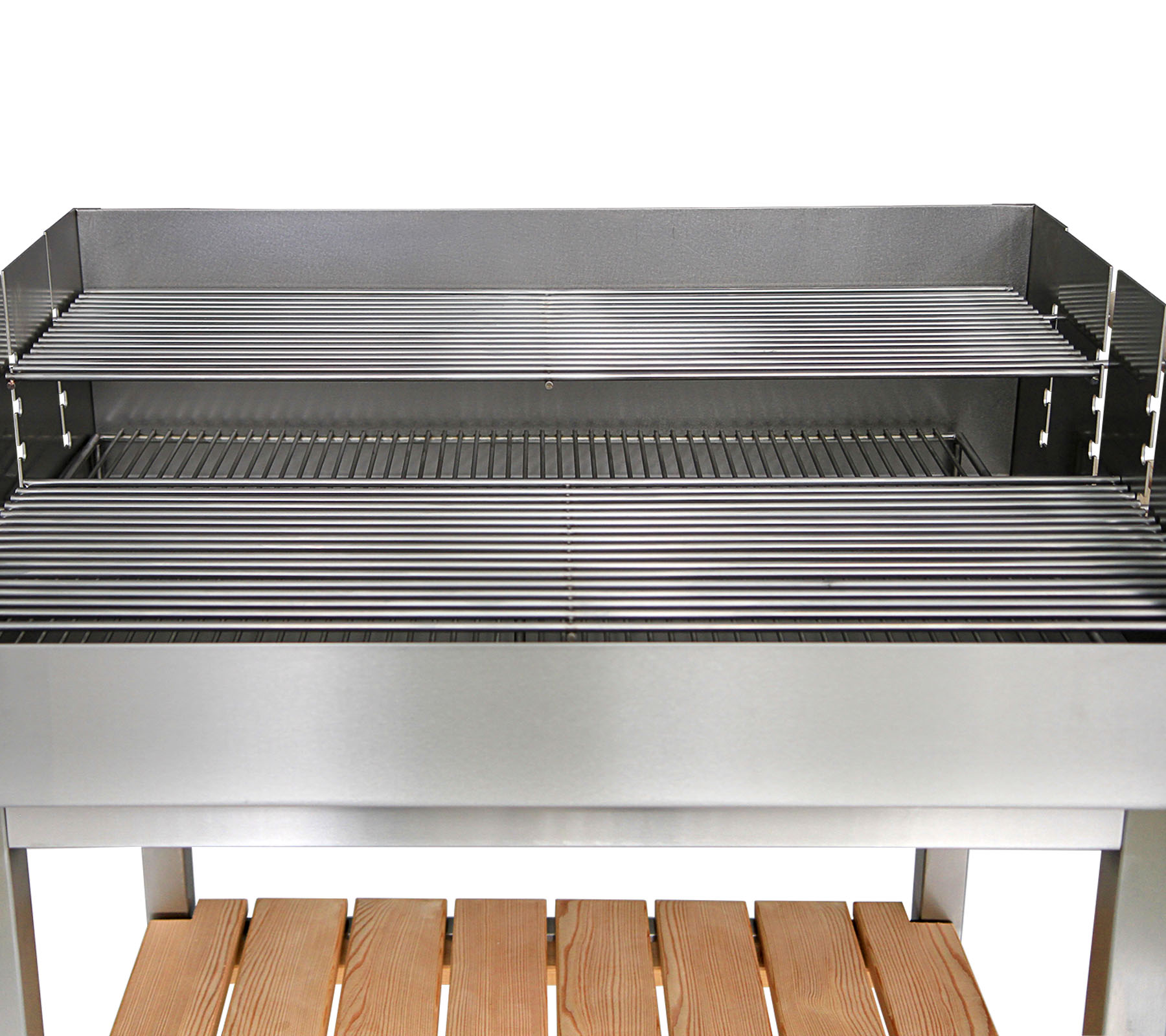 Das Grundgestell des Holzkohlegrills wird vollständig aus rostfreiem Edelstahl gefertigt und ist für den dauerhaften Einsatz im Außenbereich ausgelegt. Eine seitliche Ablage sowie ein unteres Ablagefach sind integriert und mit Massivholz aus Lärche belegt. Die Holzauflagen können bei Bedarf entnommen werden. Beide Grillroste sind jeweils 4-fach höhenverstellbar und lassen sich unabhängig voneinander positionieren. Dadurch wird das Grillen auf zwei Ebenen ermöglicht, ideal für unterschiedliche Garstufen gleichzeitig. Die seitlichen Griffe der Grillroste sind aus Holz gefertigt.