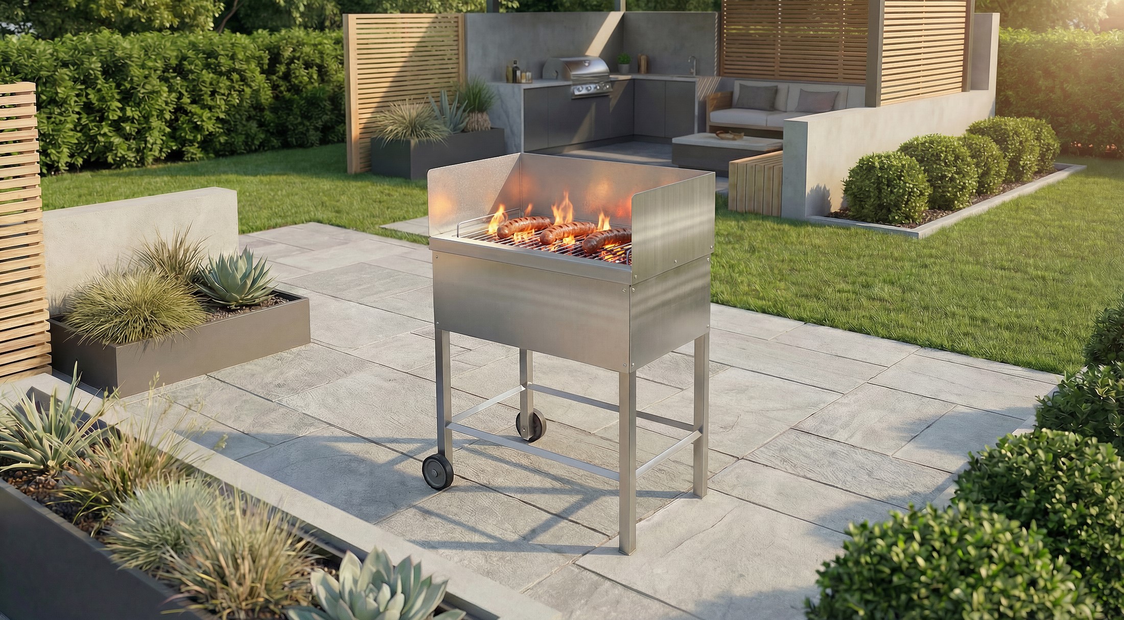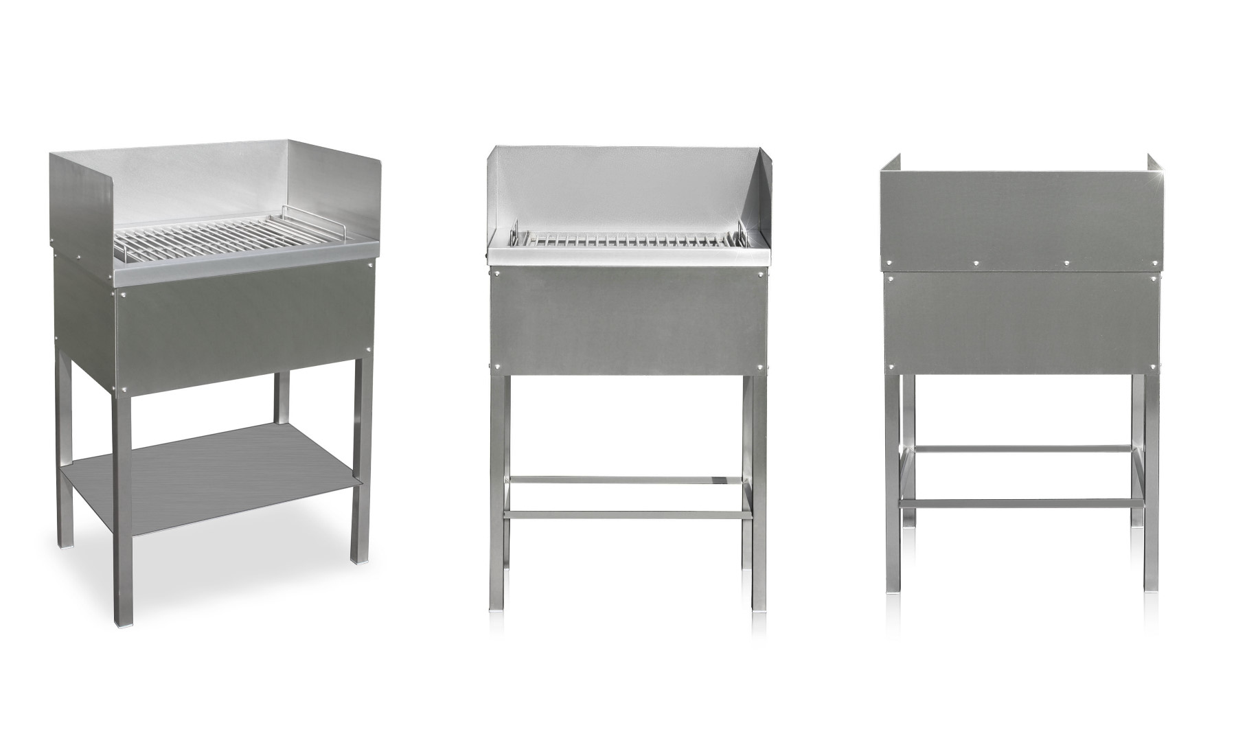 Der Holzkohlegrill wird vollständig aus rostfreiem Edelstahl gefertigt. Das Grundgestell ist auf allen vier Seiten mit Edelstahlverblendungen ausgestattet und steht stabil auf Kunststoffkappen. Ein integrierter Windschutz ist fest mit dem Gestell verbunden und sorgt für eine klare, funktionale Optik. Die Kohlewanne ist herausnehmbar und 4-fach höhenverstellbar. In ihr sitzt die ebenfalls herausnehmbare Aschewanne. Dadurch lässt sich die Hitze einfach regulieren und die Reinigung wird erleichtert.