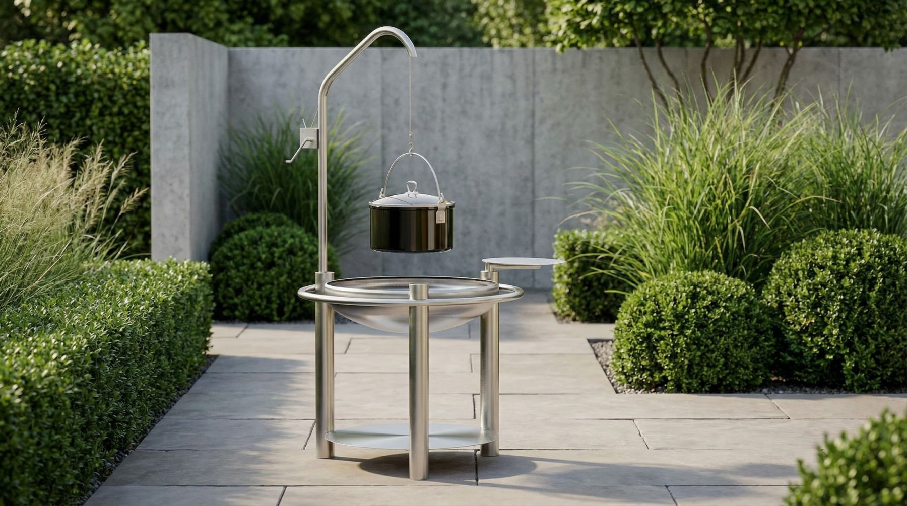 Der einsteckbare Beistelltisch wird passgenau in eine integrierte Hülse eingesetzt und schafft zusätzliche Ablagefläche. Optional kann der Grill mit zwei Rädern ausgestattet werden, was den Transport erleichtert. Ein optionaler Deckel kann während des Grillens auf die Querverstrebung aufgelegt und als Ablage genutzt werden. Der Grillgalgen lässt sich nach dem Grillen mit einer Hand entnehmen, ohne die heiße Feuerschale zu berühren. Möglich macht dies eine passgenaue Hülse in einem der Beine.