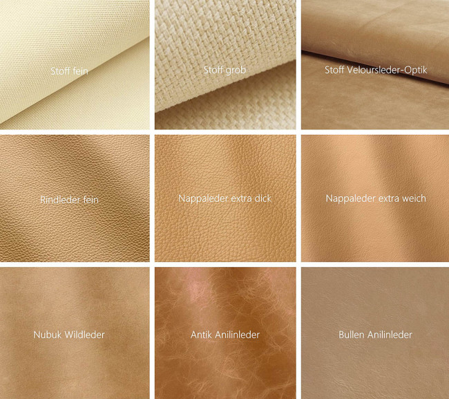 Unsere Auswahl geht über die im Shop gezeigten Farben hinaus – gerne beraten wir Sie zu weiteren Möglichkeiten. Erleben Sie die Exklusivität unseres italienischen Leders und hochwertiger Stoffe, bevor Sie Ihre Entscheidung treffen. Jedes Muster zeigt einen kleinen Ausschnitt der Oberfläche, sodass Sie Material und Farbe optimal abstimmen können.