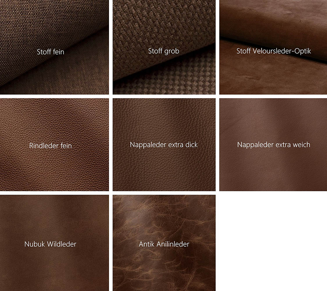 Erleben Sie die Exklusivität unseres italienischen Leders und hochwertiger Stoffe, bevor Sie Ihre Entscheidung treffen. Jedes Muster zeigt einen kleinen Ausschnitt der Oberfläche, sodass Sie Material und Farbe optimal abstimmen können.