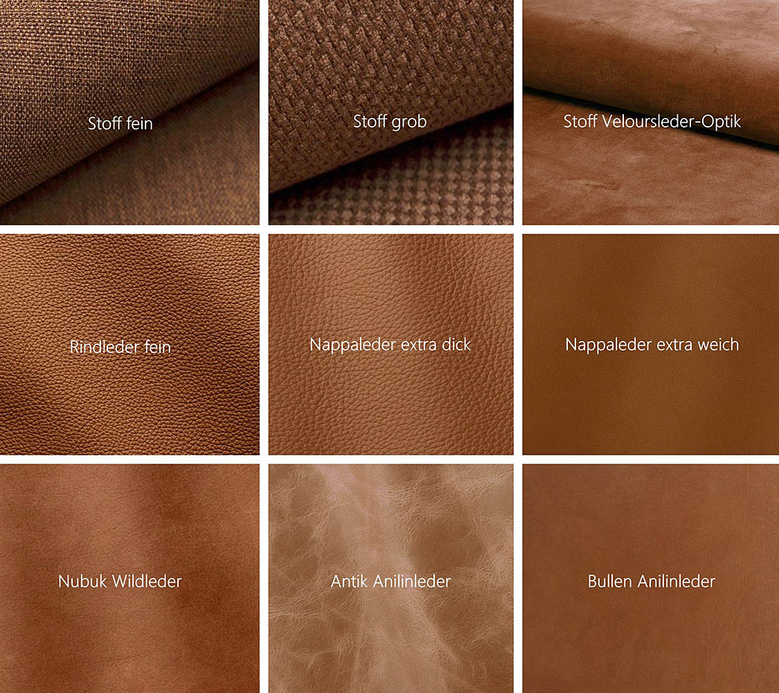 Erleben Sie die Exklusivität unseres italienischen Leders und hochwertiger Stoffe, bevor Sie Ihre Entscheidung treffen. Jedes Muster zeigt einen kleinen Ausschnitt der Oberfläche, sodass Sie Material und Farbe optimal abstimmen können.