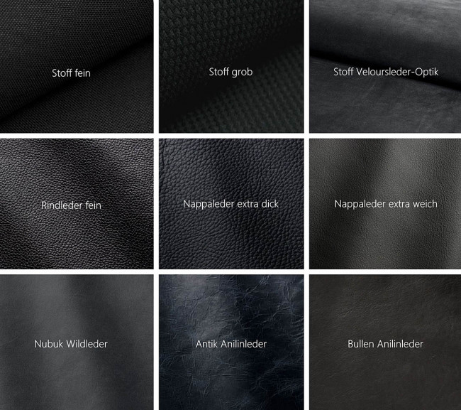 Erleben Sie die Exklusivität unseres italienischen Leders und hochwertiger Stoffe, bevor Sie Ihre Entscheidung treffen. Jedes Muster zeigt einen kleinen Ausschnitt der Oberfläche, sodass Sie Material und Farbe optimal abstimmen können.
