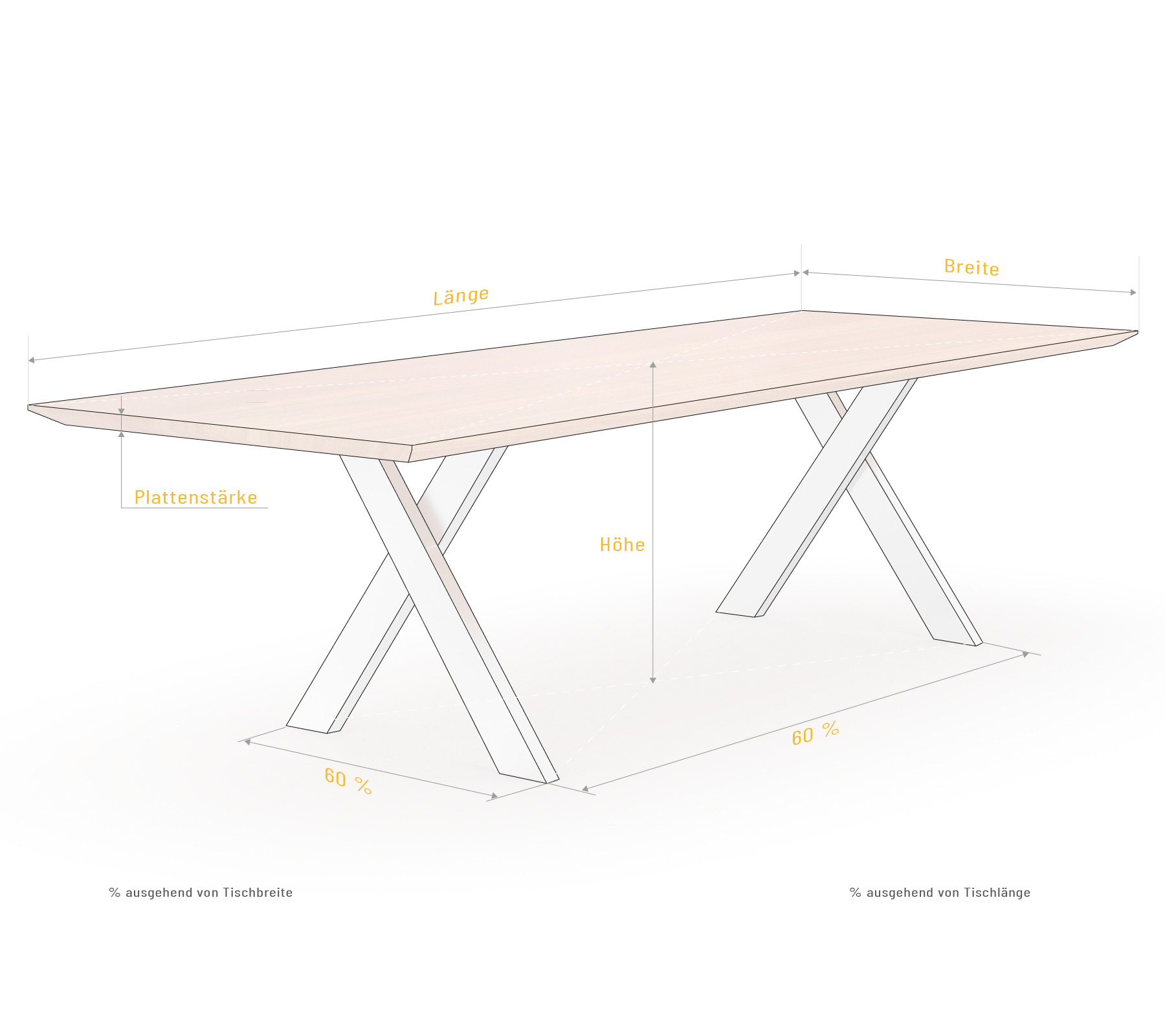 Die Tischplatte aus massivem Naturholz wird zum Partner fürs Leben und lädt zum Verweilen ein. Entdecken Sie unsere riesige Holzauswahl und finden Sie heraus, welches Holz zu Ihnen passt. Mit dieser Massivholztischplatte wird Ihr Zuhause auch ein wahrer Ort zum Wohlfühlen. Dazu ein Tischgestell X-trem! Für doppelte Freude sorgen die x-förmigen Tischbeine. So akkurat schlicht und dennoch auffällig fügt es sich einfach tadellos unter die hölzerne Tischplatte. Der hochwertig verarbeitete Stahl oder Edelstahl bildet hier einen imposanten Kontrast zum Massivholz und wird zum Anziehungspunkt in Ihrem Wohnraum. Finden Sie mit Hilfe unseres Konfigurators die richtige Holzart für Ihr Möbel nach Maß. Die positive visuelle und haptische Authentizität von Holzoberflächen werden Ihre Wohnatmosphäre besonders aufwerten. Mit unserer Hilfe können Sie Ihr gesamtes Interieur nach Ihren Vorstellungen anpassen. Produktbilder können von Ihrer Konfiguration abweichen, da nicht alle Parameter abgebildet werden können. Zur besseren Vorstellung fordern Sie bitte eine Visualisierung an.