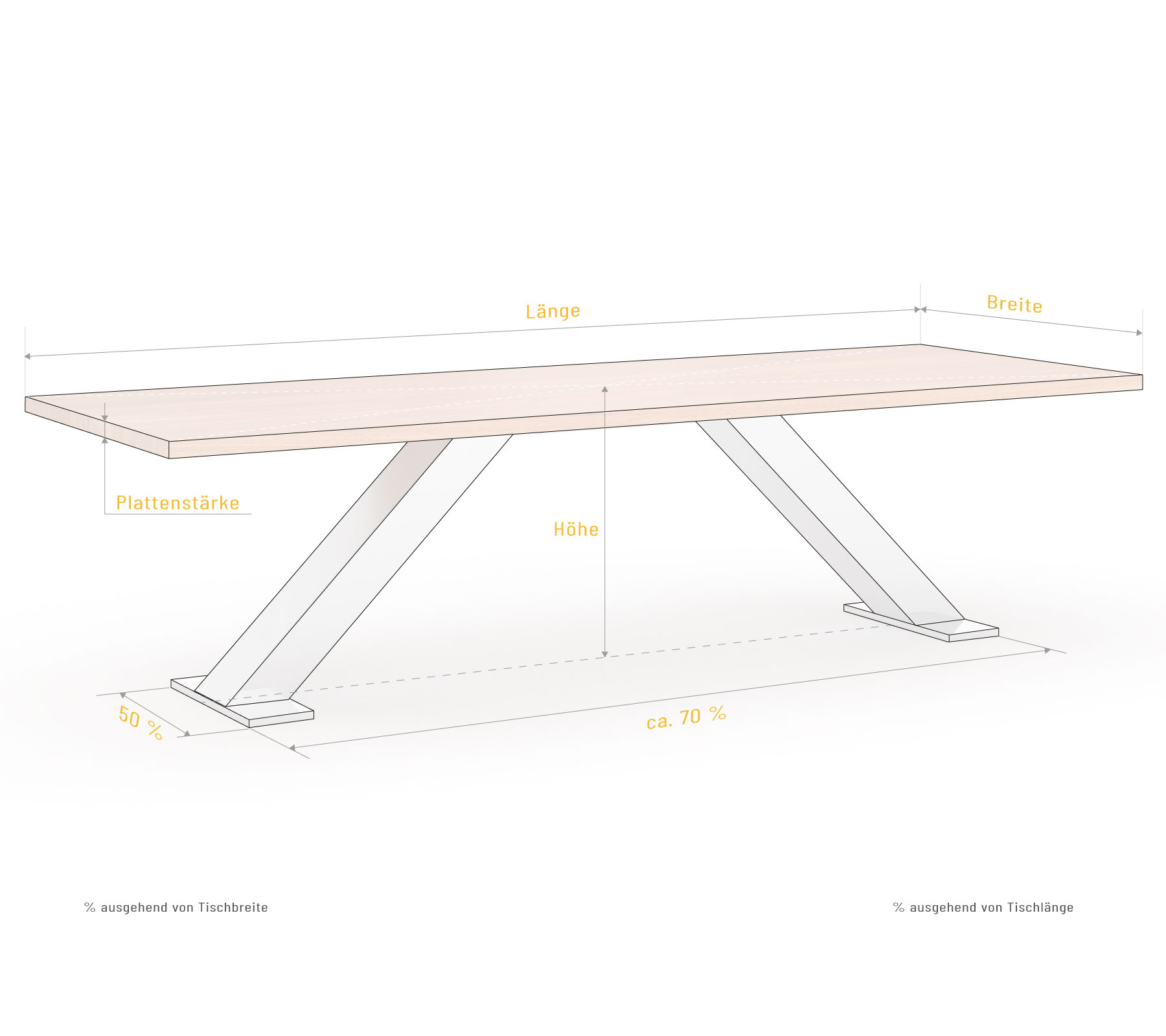 Dieses Tischgestell macht einfach alles anders. Zwei schräg stehende Tischfüße balancieren mit sicherer Stabilität die Tischplatte und machen dabei noch einen richtig guten Eindruck. Anders als bei anderen Gestellen bietet dieses absolute Beinfreiheit und somit einen überragenden Sitzkomfort. Noch dazu können Sie, wie auch bei der Tischplatte, zahlreiche Gestaltungsformen selbst etablieren. Entscheiden Sie beispielsweise zwischen Edelstahl, Stahl oder als farblichen „Tupfer“ in RAL-Farben. Das Gestell können Sie in Edelstahl- oder Schwarzstahl wählen. Eine farbliche Lackierung ist ebenfalls möglich.