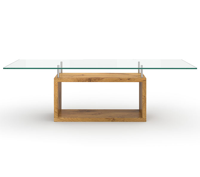 Die klare Glasplatte zeigt seinen besonderen Unterbau perfekt, somit werden alle Blicke auf das vom Feinsten verarbeitete Holz gezogen. Die Glasplatte besticht durch ihre Eigenschaften: 1,2 cm klares, gehärtetes Sicherheitsglas bietet die hohe Sicherheit, die ein Glastisch braucht. Auf Wunsch ist die Glasplatte auch in satiniert, eingefärbt, lackiert oder entfärbt lieferbar.