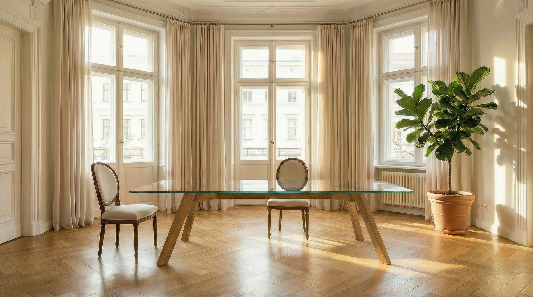 Die klare Glasplatte zeigt seinen besonderen Unterbau perfekt, somit werden alle Blicke auf das vom Feinsten verarbeitete Holz gezogen. Durch unsere Ölung wird das Holz perfekt versiegelt, die natürliche Optik und Haptik bleiben dabei unberührt. Alternativ bieten wir die Holzoberfläche auch in gewachst oder lackiert an. Die Glasplatte besticht durch ihre Eigenschaften: 1,2 cm klares, gehärtetes Sicherheitsglas bietet die hohe Sicherheit, die ein Glastisch braucht. Auf Wunsch ist die Glasplatte auch in satiniert, eingefärbt, lackiert oder entfärbt lieferbar.