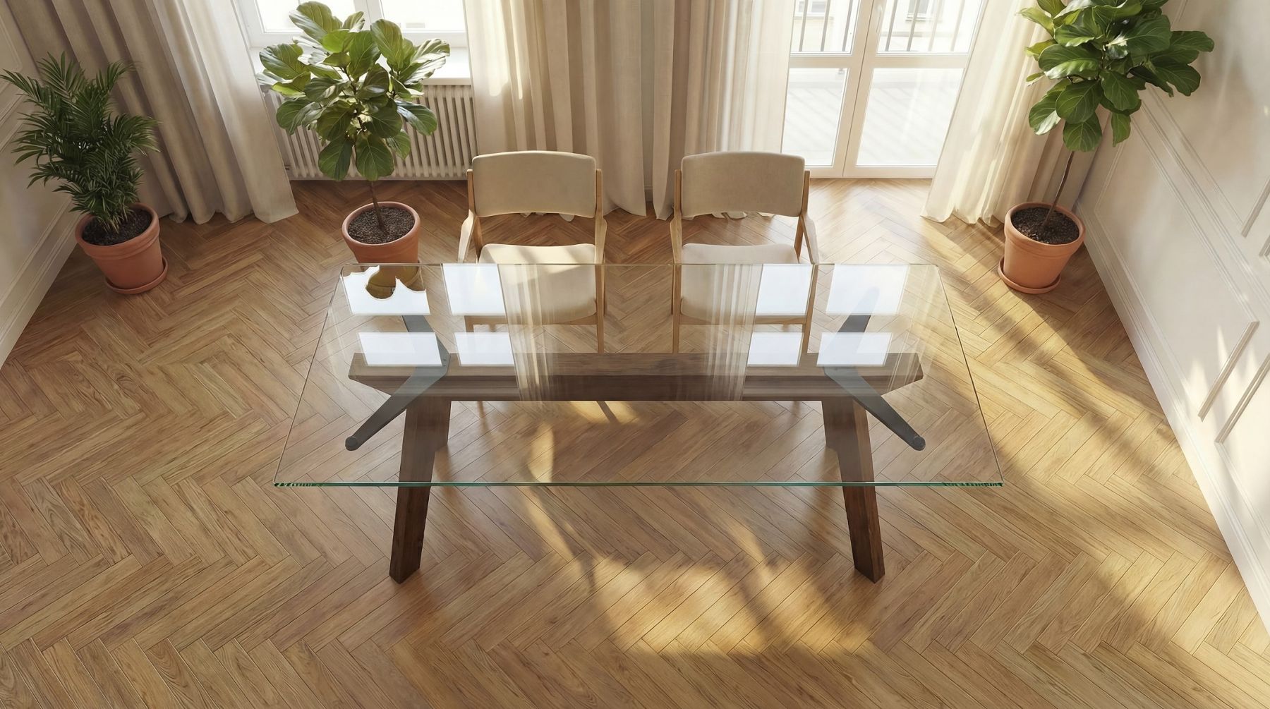 Esstisch Kairo mit Glasplatte und Holzuntergestell