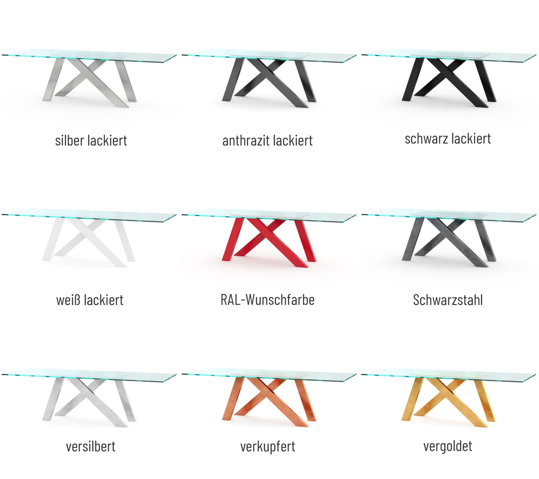 Mit seiner außergewöhnlichem Optik und einem spannenden Materialmix kann der Glastisch Aachen überzeugen! Das exklusiv designte Kreuzgestell in Stahl oder Edelstahl zieht hier alle Blicke auf sich. Die starke und stabile Optik ist ideal für Liebhaber des modernen Designs. Durch Charakter und Klasse wird dieser Tisch Sie und Ihre Gäste beeindrucken. Das Design steht hier klar im Vordergrund und vereint Metall und Sicherheitsglas in höchster Güte. Als Highlight können Sie das Glas sowie das Gestell in verschiedenen Ausführungen bzw. farblich lackiert bestellen - so heben Sie sich ab und können ihn farblich an Ihren Wohnraum anpassen. Das 1,2 cm klare, gehärtete Sicherheitsglas bietet die notwendige Sicherheit, die ein Glastisch braucht. Auf Wunsch ist die Glasplatte auch in satiniert, eingefärbt, lackiert oder entfärbt lieferbar. Produktbilder können von Ihrer Konfiguration abweichen, da nicht alle Parameter abgebildet werden können. Zur besseren Vorstellung fordern Sie bitte eine Visualisierung an.