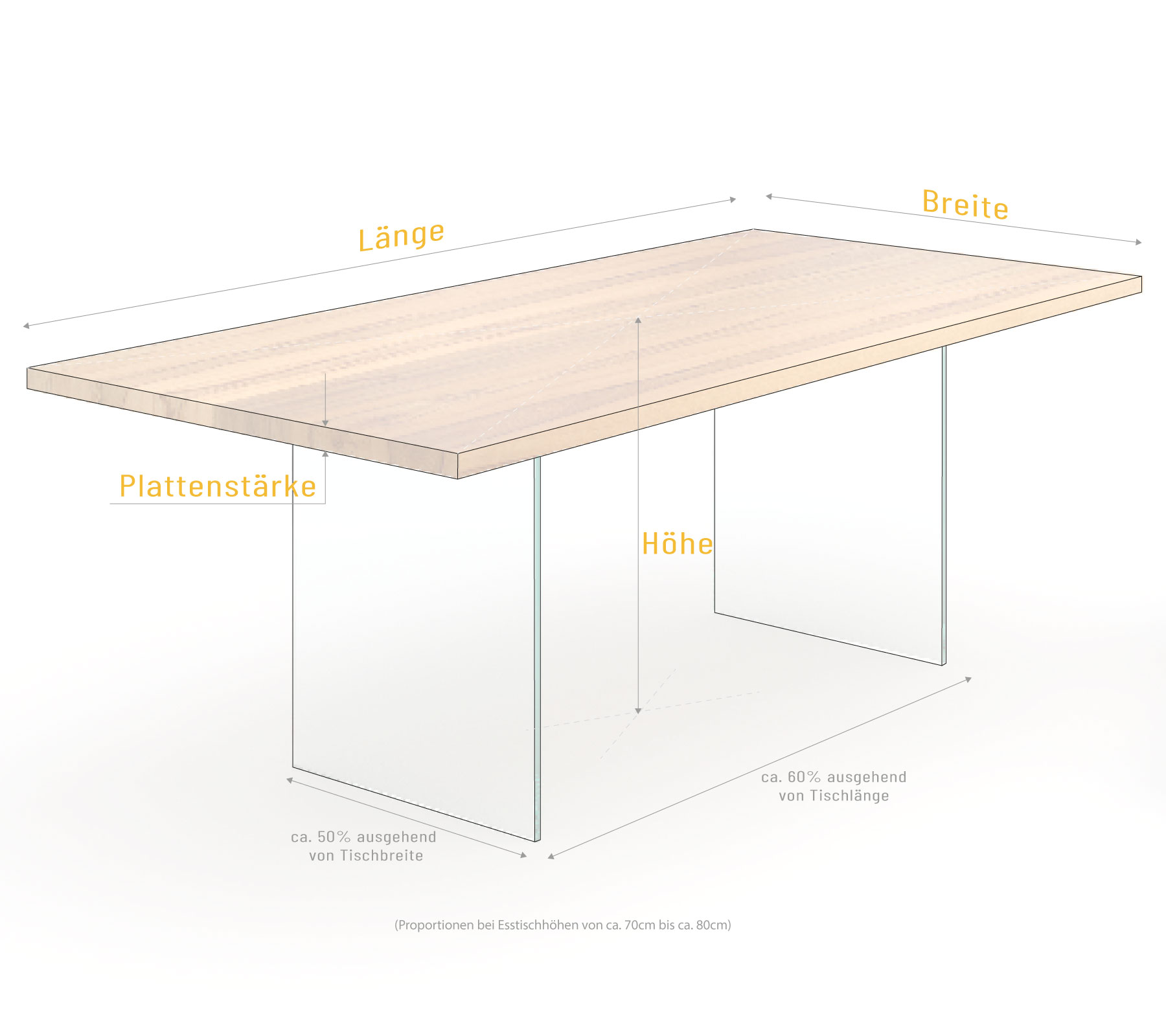 Die Tischplatte besteht aus Massivholz und ist dadurch sehr stabil und robust, überdies ergänzt dieser einladende Designertisch nach Maß mit seinen einmaligen Feinheiten perfekt ein natürliches Wohnkonzept. Durch unsere handwerkliche Kenntnis werden uns die unterschiedlichsten Holzverarbeitungen ermöglicht. Egal, ob eine Baumkante- oder eine Stadionform, wir fertigen nach Ihren Vorstellungen. Konfigurieren Sie im oberen Bereich Ihre Materialien Massivholz und Glas. Wählen Sie zwischen 40 Hölzern und 8 unterschiedlichen Varianten für die Glaswangen. Entscheiden Sie zwischen den verschiedensten Variationen zur Kanten- und Oberflächenbearbeitung, Holzversiegelung und Tischplattenform - von der Eiche bis zur Zirbe. Eine glasklare Sache - das gläserne Gestell vermittelt ein Gefühl von Leichtigkeit und Harmonie und trägt die Tischplatte auf sicheren „Händen“. Es entsteht die perfekte Ruhezone in schwebender Gestalt und atemberaubenden Design, zum Entspannen, Genießen und Bestaunen - und natürlich zum alltäglichen Gebrauch. Produktbilder können von Ihrer Konfiguration abweichen, da nicht alle Parameter abgebildet werden können. Zur besseren Vorstellung fordern Sie bitte eine Visualisierung an.