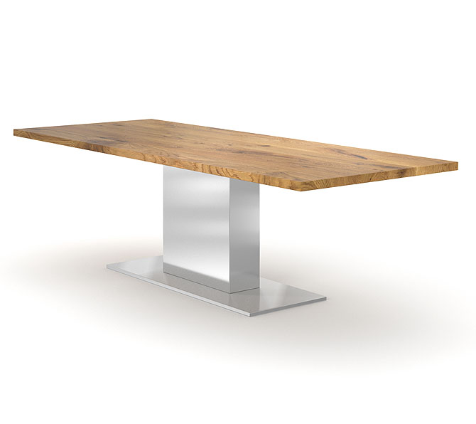 Die Tischplatte besteht aus Massivholz und ist dadurch sehr stabil und langlebig. Überdies ergänzt dieser einladende Esszimmertisch mit seinen einmaligen Feinheiten aus Edelstahl und Holz perfekt ein stilvolles Wohnkonzept. Das Tischgestell in Edelstahl oder Stahl optimal in Funktion und Design konstruiert, bietet genügend Platz für Ihre Beine und besticht dazu noch mit einem unvergesslichen Blickfang. Dürfen wir vorstellen: das neue Highlight Ihres Esszimmers! Variieren Sie in Länge, Breite und Höhe Ihres Tisches, wählen Sie zwischen Buche, Eiche, Kirschholz und vieles mehr und erschaffen dadurch Ihr eigenes Einzelstück. Der von uns in Deutschland entwickelte Tisch verbindet hochwertige Qualität und ein ausgewogenen Designanspruch. So macht der nächste Tischdienst garantiert Spaß. Produktbilder können von Ihrer Konfiguration abweichen, da nicht alle Parameter abgebildet werden können. Zur besseren Vorstellung fordern Sie bitte eine Visualisierung an.