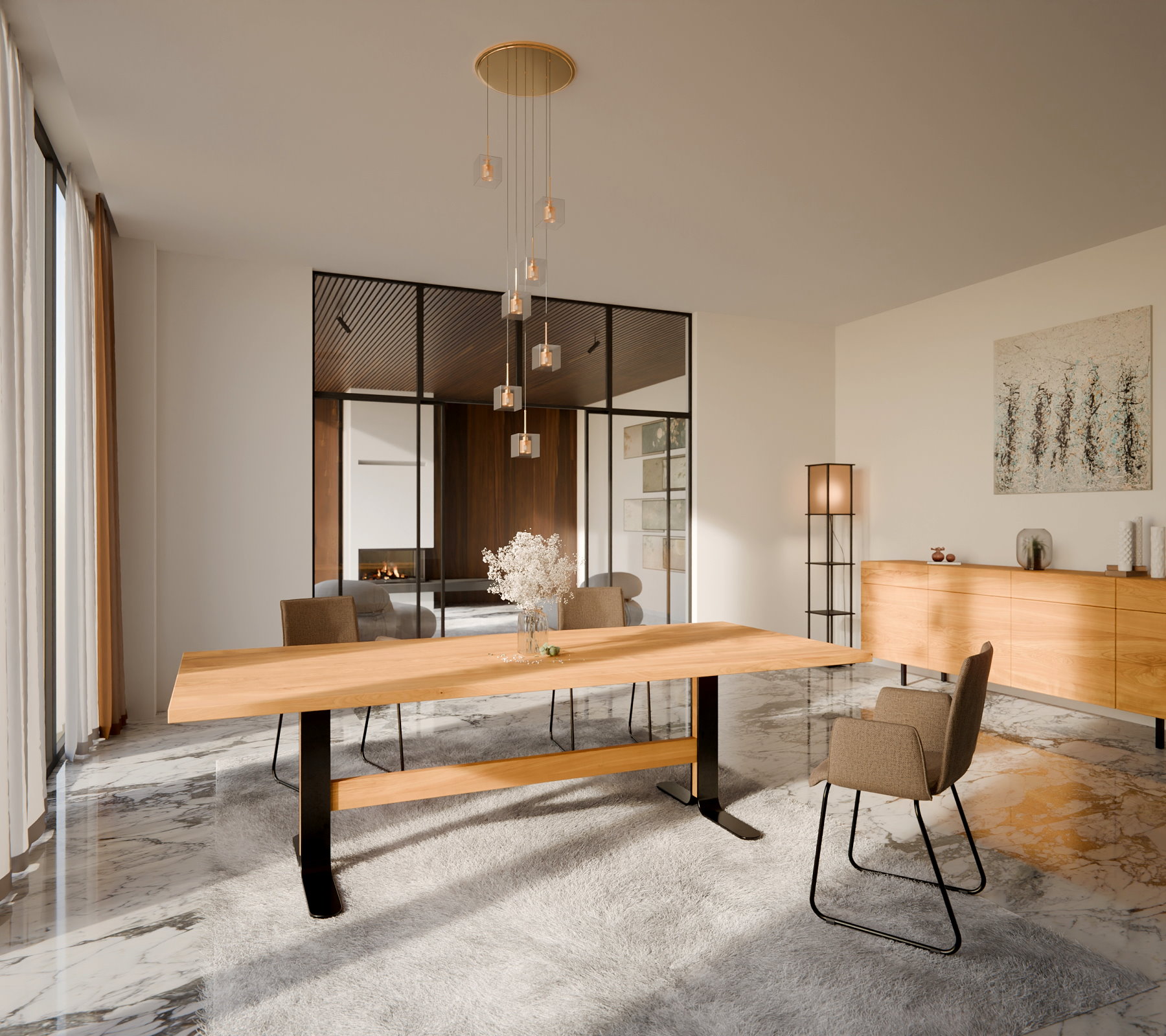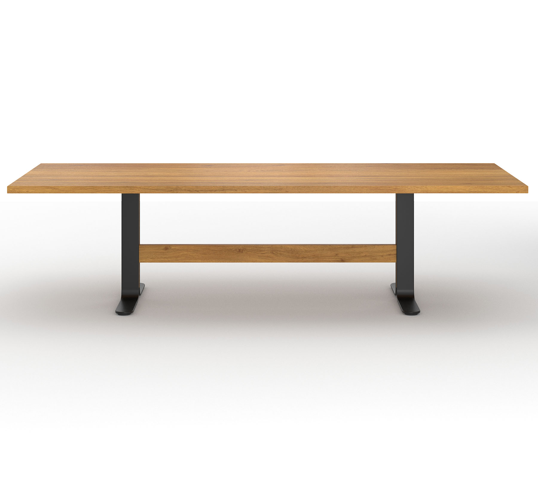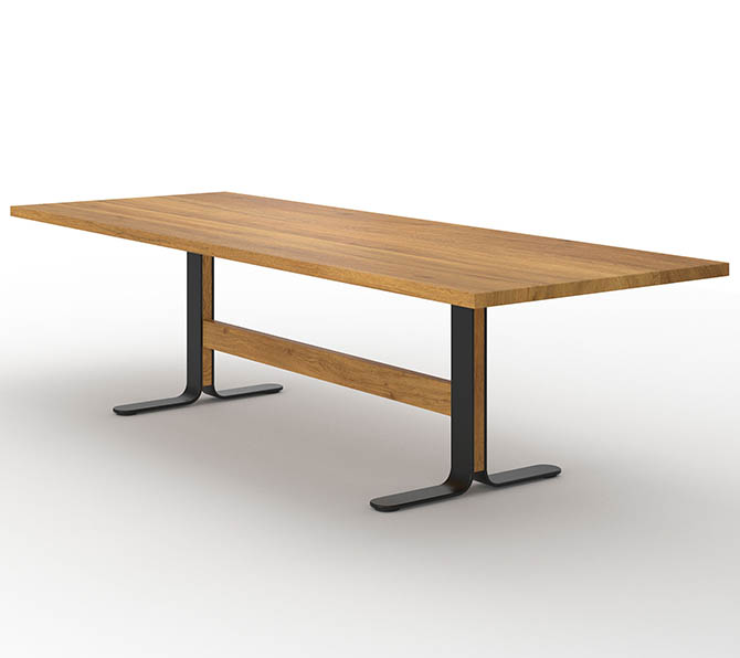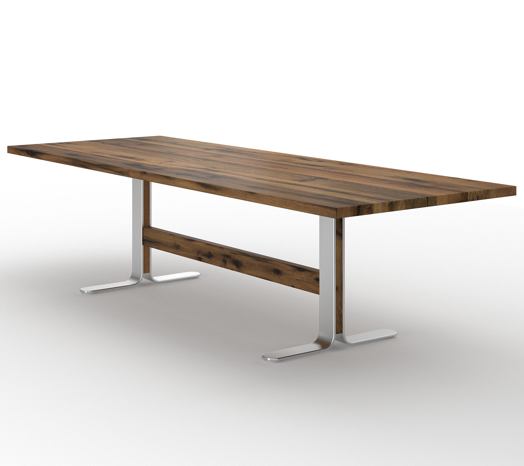 Gutes Design ist für die Ewigkeit – mit zarter Geradlinigkeit und gekonnten Rundungen entsteht hier ein Tischgestell aus robustem Stahl oder Edelstahl in verschiedensten Bearbeitungsfinishen kombiniert mit eleganten Massivholz ganz nach Ihrer Wahl. Die Zwischenräume der zwei Tischbeine werden mit feinem Vollholz gefüllt, ein Parallelbalken sorgt für Stabilität und Blickfang im ausgefallenen und einzigartigen Stil.