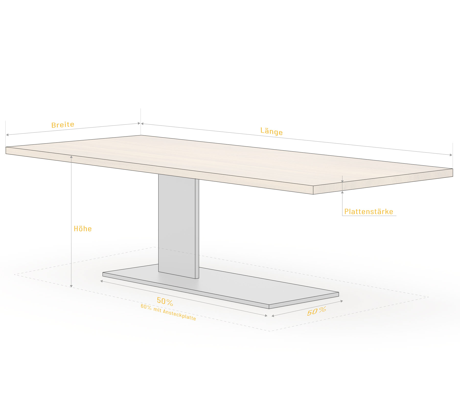 Damit der Tisch nicht allzu kühl wirkt, unterstreicht die Tischplatte aus noblen Massivholz die wärmende Atmosphäre. Je nach Holzart übermittelt die Holzstruktur ein beeindruckend raues oder auch angenehm gleichmäßiges optisches Raumklima. Passend zur Tischgröße, welche Sie frei wählen können, ist auch die Tischplattenstärke sowie die Kantenbearbeitung ganz nach Ihrem Geschmack variabel konfigurierbar. So können die Proportionen des Tisches und der Tischplatte stets an Ihren Stil und Ihre Wohneinrichtung angepasst werden. Für alle, die es lieber überschaubar mögen ist das Tischgestell eine wirkliche Augenweide. Ohne großen Schnickschnack, ohne völlig überflüssige Details – ganz schlicht und mit rundungsloser Silhouette überzeugt es alle Fans des industriellen Stils. Frei wählbar sind hierbei die Materialien: wählen Sie Edelstahl für eine weniger rustikale, fast schon königliche Optik oder Stahl für den besonders markanten Look. Natürlich sind auch alle Farben der RAL-Farbpalette für den extra Farbkick des Mittelfußes wählbar. Produktbilder können von Ihrer Konfiguration abweichen, da nicht alle Parameter abgebildet werden können. Zur besseren Vorstellung fordern Sie bitte eine Visualisierung an.