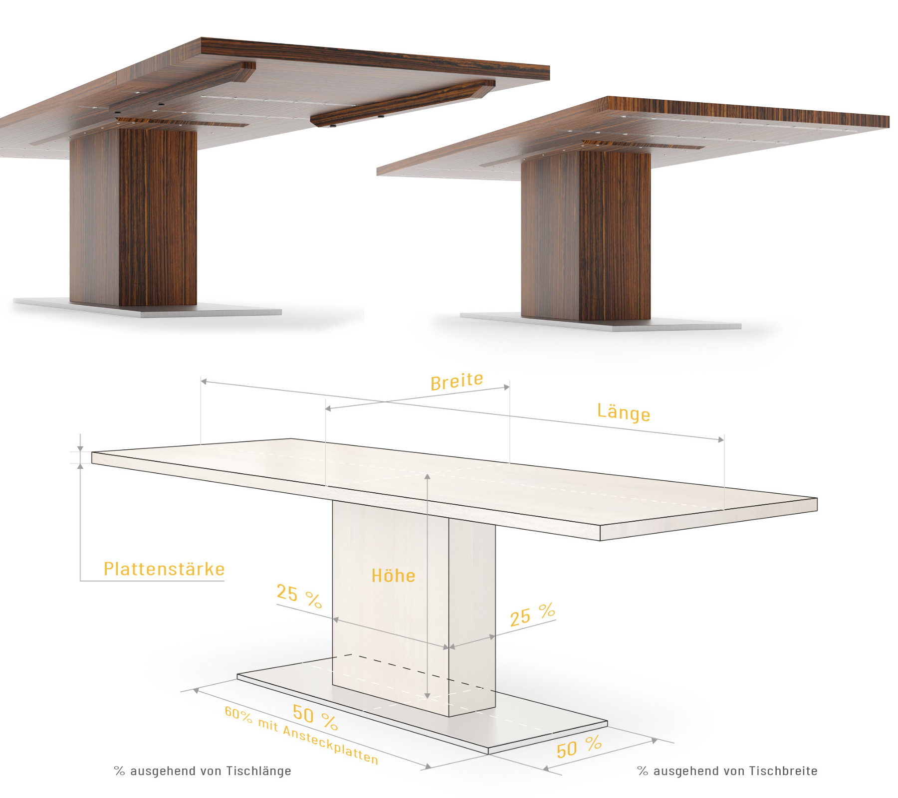 Eine Vergrößerung des Tisches ist durch zusätzliche Ansteckplatten möglich. Entscheiden Sie sich für 1 oder 2 Ansteckplatten für Ihr Modell und bleiben Sie so bequem flexibel bei der Vergrößerung Ihres Tisches.