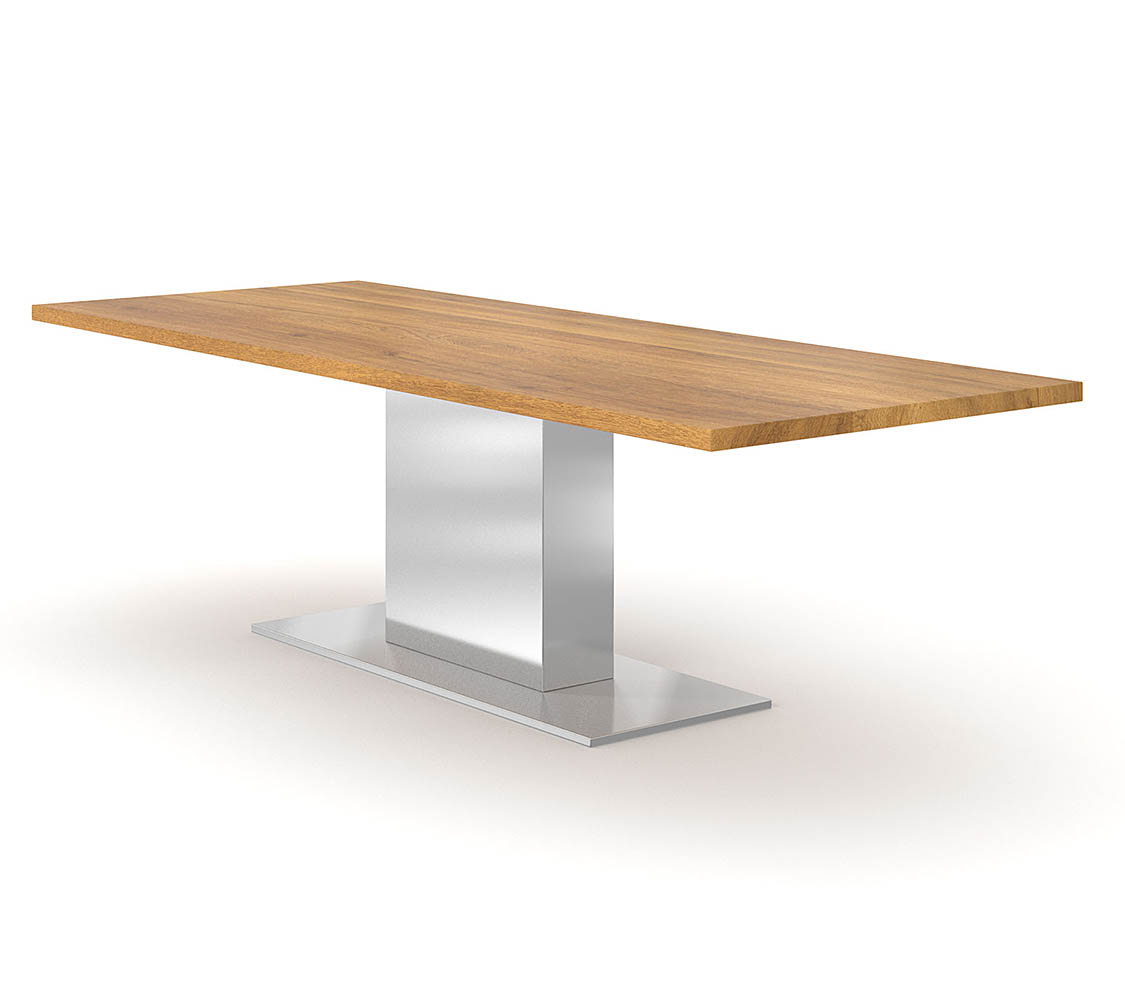 Die Tischplatte besteht aus Massivholz und ist dadurch sehr stabil und langlebig. Überdies ergänzt dieser einladende Esszimmertisch mit seinen einmaligen Feinheiten aus Edelstahl und Holz perfekt ein stilvolles Wohnkonzept. Das Tischgestell in Edelstahl oder Stahl optimal in Funktion und Design konstruiert, bietet genügend Platz für Ihre Beine und besticht dazu noch mit einem unvergesslichen Blickfang. Dürfen wir vorstellen: das neue Highlight Ihres Esszimmers! Variieren Sie in Länge, Breite und Höhe Ihres Tisches, wählen Sie zwischen Buche, Eiche, Kirschholz und vieles mehr und erschaffen dadurch Ihr eigenes Einzelstück. Der von uns in Deutschland entwickelte Tisch verbindet hochwertige Qualität und ein ausgewogenen Designanspruch. So macht der nächste Tischdienst garantiert Spaß. Produktbilder können von Ihrer Konfiguration abweichen, da nicht alle Parameter abgebildet werden können. Zur besseren Vorstellung fordern Sie bitte eine Visualisierung an.