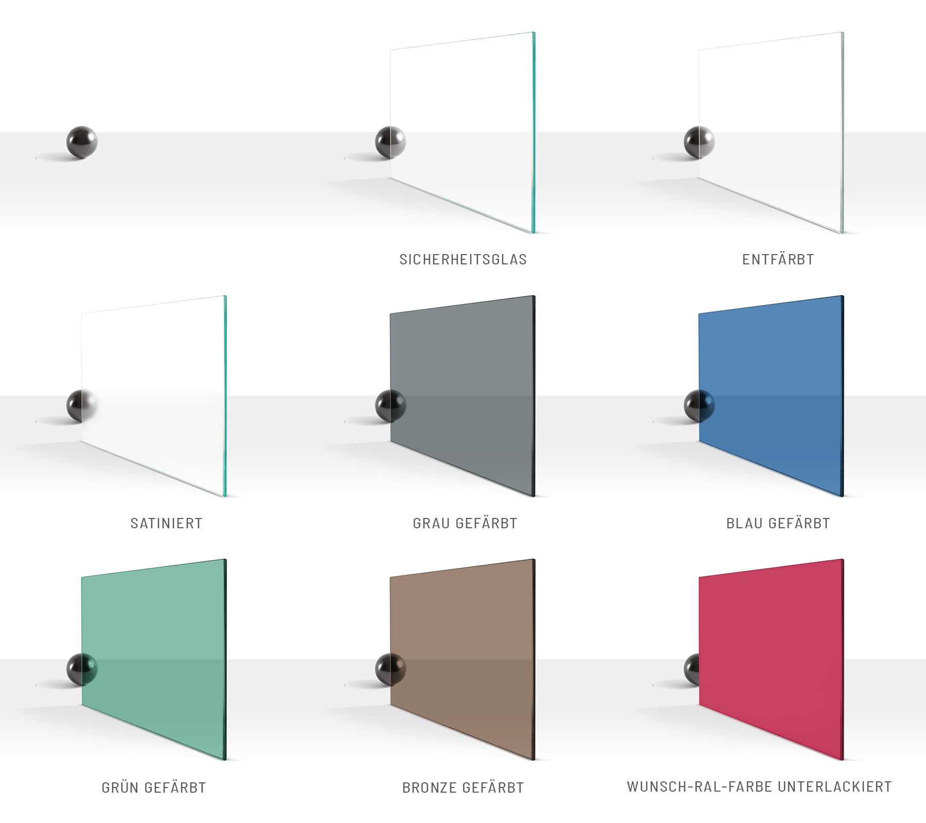 Glas und Gestell können in verschiedenen RAL-Farben lackiert werden. Als RAL-Farben bezeichnet man eine Anzahl an normierten Farbtönen, welche von der RAL gGmbH erstellt und verwaltet werden. Im Jahr 1927 bestand die Normung lediglich nur aus 40 Farben. Mittlerweile gibt es über 2.500 RAL Farben, welche in Industrie, Handwerk und Design sowie bei den professionellen Farbanwendern ein weltweit bestimmender Standard sind. Anbei erhalten Sie einen Link zu den RAL-Classic Farben, um für Ihre Glasplatte oder Tischgestell die passende Farbveredlung zu finden. Wenn Sie sich für eine Farbe entschieden haben, können Sie dies im Bemerkungsfeld während des Bestellvorgangs angeben oder unseren Kundenservice unter den genannten Kontaktdaten per Telefon oder E-Mail mitteilen.