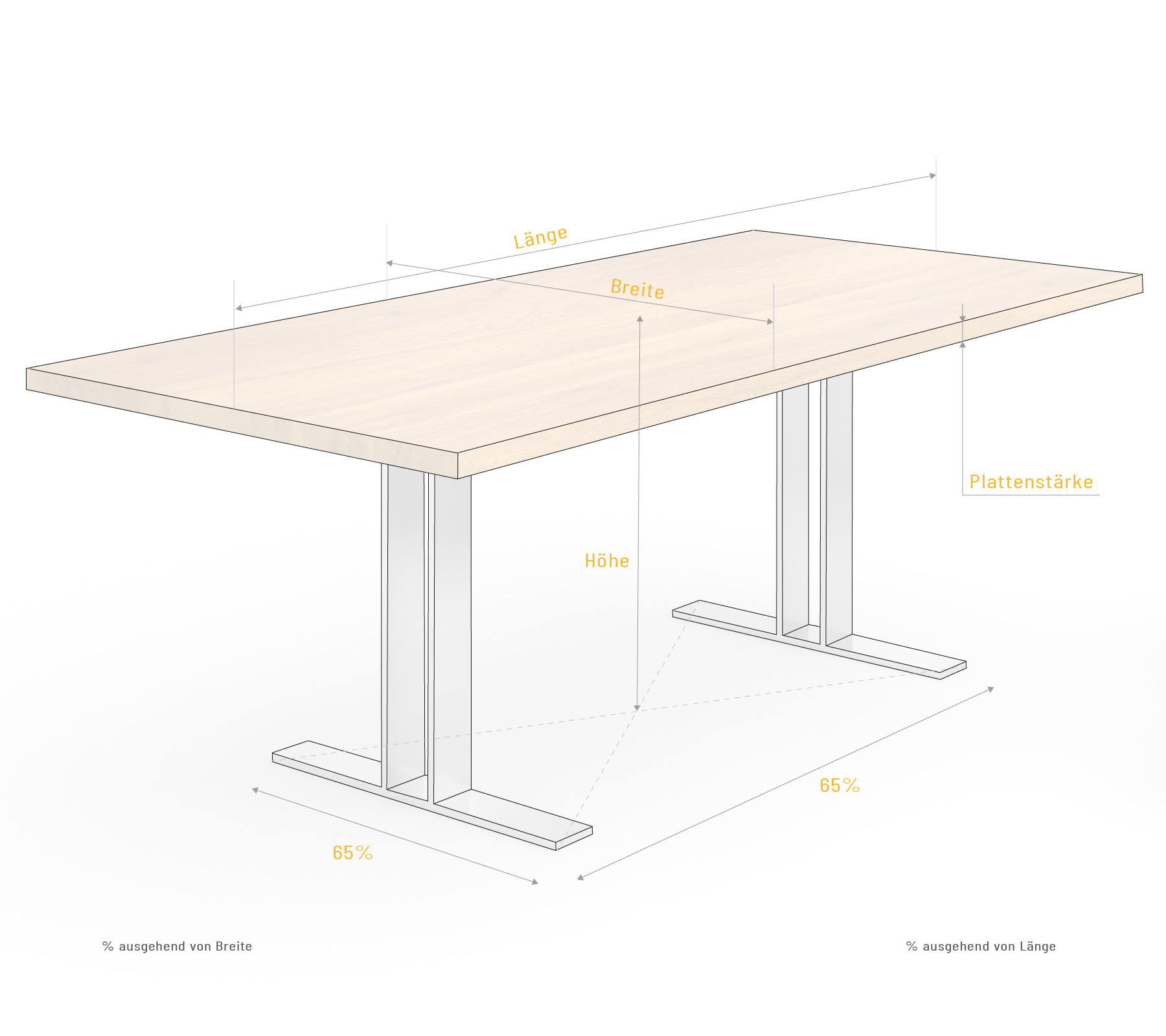 Das Tischgestell können Sie aus Edelstahl gebürstet oder Stahl auswählen. Der Stahl kann zusätzlich eine farbliche Beschichtung erhalten oder raffiniert mit Blattgold, Blattsilber oder Blattkupfer veredelt werden.