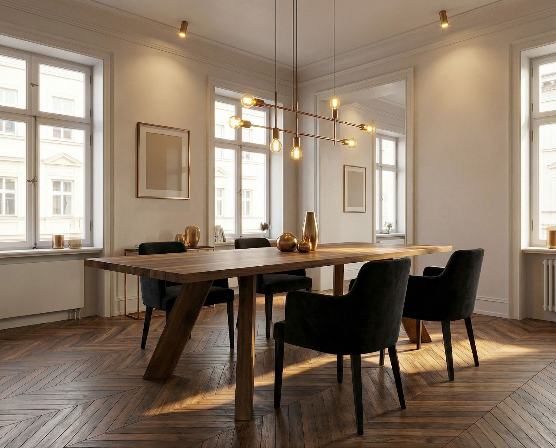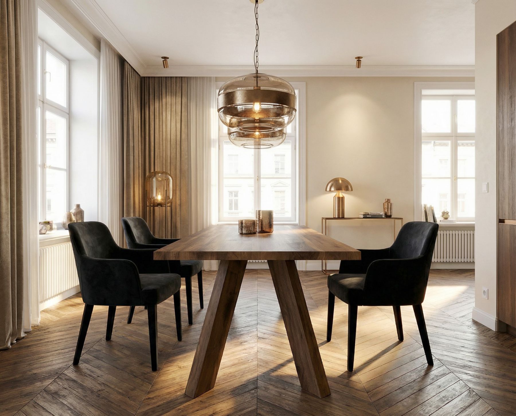 Tischlein deck dich. Unser Esstisch Vermont aus Massivholz ist ein wahres Meisterstück der Handwerkskunst. Massivholzmöbel schaffen für alle Wohnräume z. B. Küche, Arbeitszimmer, Schlafzimmer, Esszimmer, oder Konferenzräumen ein angenehmes und gesundes Raum- und Wohnklima. Unser Esstisch Vermont ist besonders zeitlos, umweltfreundlich und ästhetisch ansprechend und passt fast zu jedem Einrichtungsstil. Durch seine hochwertigen Baumaterialien und Konstruktion ist dieser Tisch Langlebig und Belastbar. Die Tischbeine sind wirklich gut in Form. Einzigartig sorgen diese für ausreichend Halt der Tischplatte und für einen unwiderstehlichen Anblick. Die sehr praktische Konstruktion des Tisches bieten Ihnen viel Platz für gemütliche Dinner, Home-Office oder Dekorationen und vieles mehr.