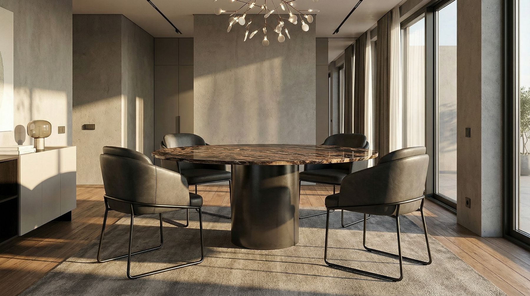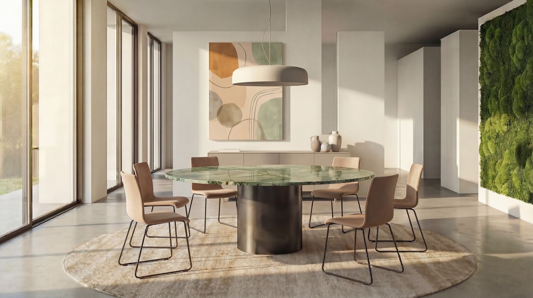 Anders als bei herkömmlichen Säulentischen verzichtet der Esstisch Lancy auf eine Bodenplatte. Die hochwertige Steinplatte, egal in welcher Form, lässt dieses Modell sehr zeitlos aussehen und bringt ein modernes, angenehmes Flair in jede Räumlichkeit. Produktbilder können von Ihrer Konfiguration abweichen, da nicht alle Parameter abgebildet werden können. Zur besseren Vorstellung fordern Sie bitte eine Visualisierung an.
