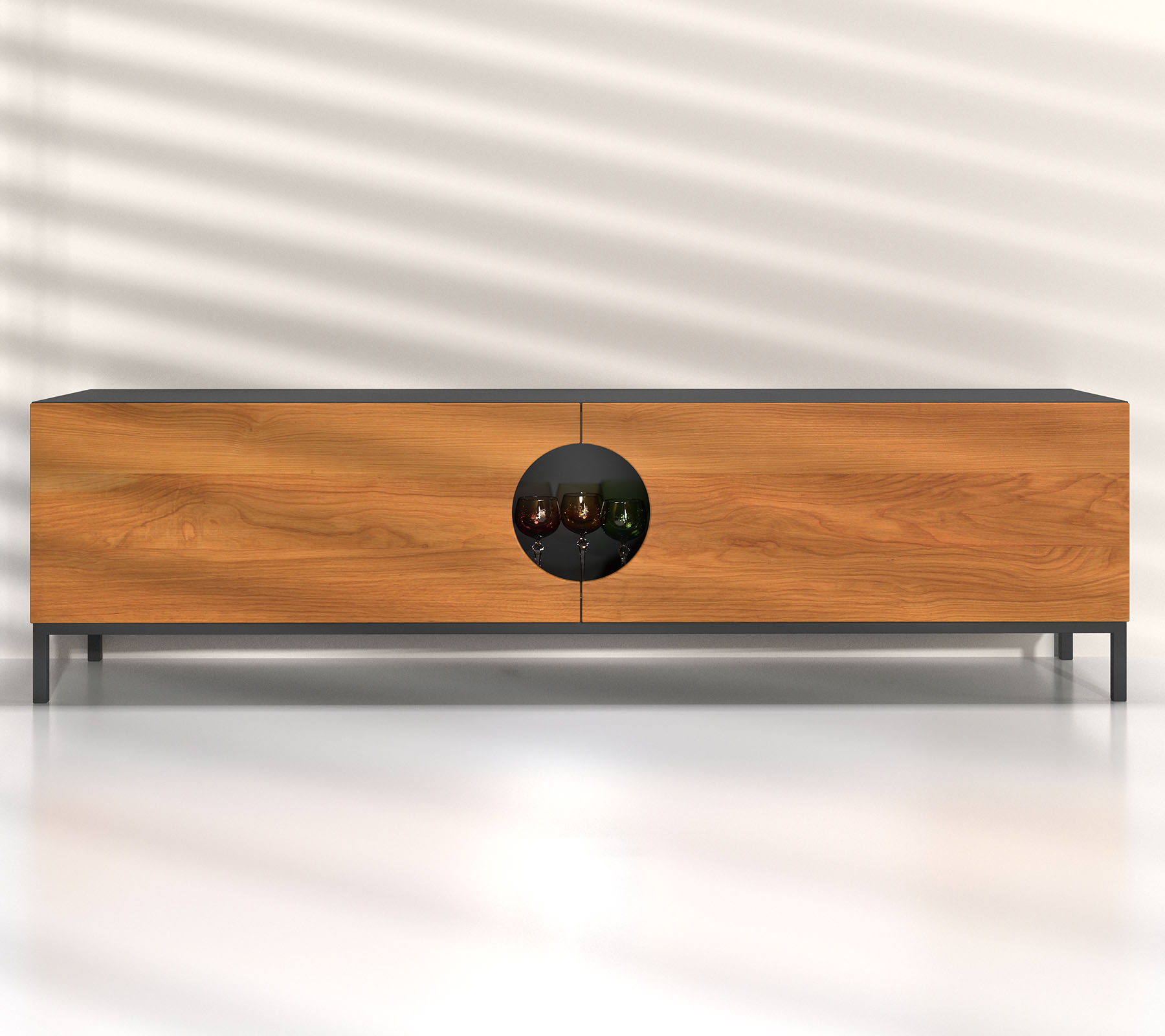 fertig montiertes Lowboard aus Massivholz mit Bullauge – starkes Design auf höchstem Niveau