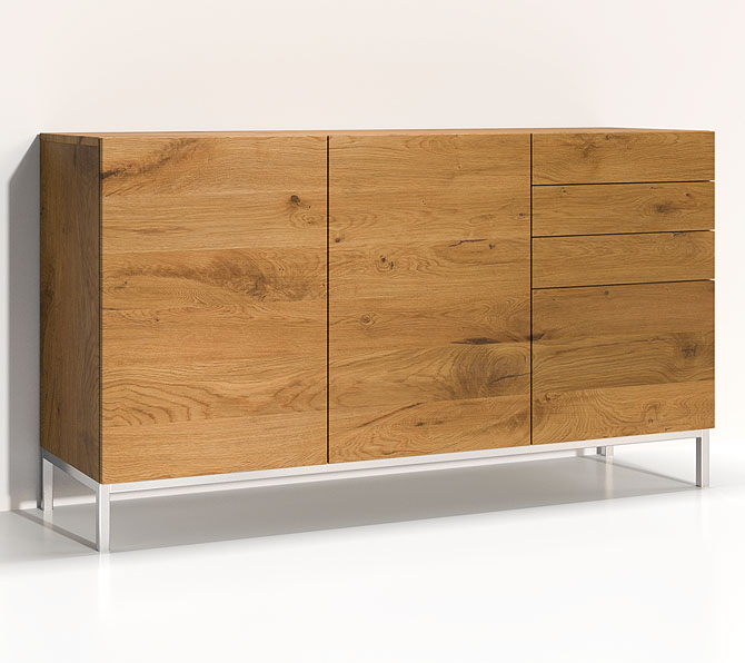 Das Sideboard „Berlin“ mit Schubkästen gliedert sich harmonisch in Ihr Wohnkonzept ein. Das Board wird aus Massivholz gefertigt und hat eine glatte und natürliche Oberfläche oder wunschgemäß eine gebürstete Oberfläche. Der Schrank bietet genügend Stauraum für zahlreiche Utensilien. Mit breiten Holzbohlen und perfekt aufeinander abgestimmten Schnittkanten braucht sich dieser Schrank nicht verstecken. Die filigranen und doch stabilen Füße aus professionell geschliffenem Edelstahl runden das Gesamtbild ab. Der anmutende Edelstahlglanz bringt Ihnen hochwertige und stilsichere Unterstützung in Ihr Zuhause. Das Gestell können Sie ebenso in Stahl roh konfigurieren oder eine farbige Lackierung wählen.