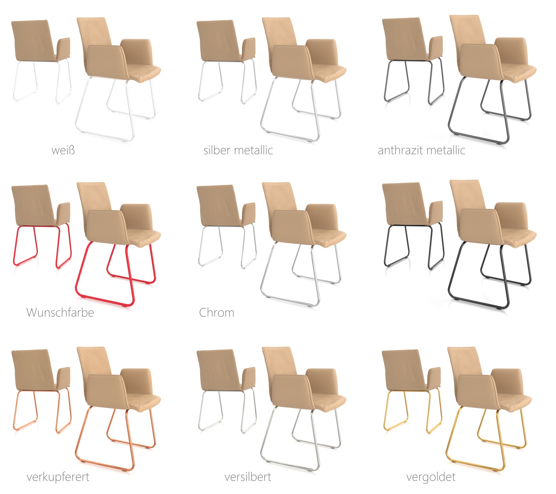 Innenarchitekten und Interieur-Designer schätzen es, die Metallgestelle unserer Sitzmöbel in den unterschiedlichsten RAL-Farben sowie extravaganten Gold-, Silber- und Kupfertönen gestalten zu können. Räume, in denen jedes Detail perfekt aufeinander abgestimmt ist, wirken besonders harmonisch und einladend. Besitzt Ihr Tisch ein Metallgestell, können Sie die Kufen Ihrer neuen Stühle für das Esszimmer im gleichen bzw. einem ähnlichen Ton aussuchen. Produktbilder können von Ihrer Konfiguration abweichen, da nicht alle Parameter abgebildet werden können. Zur besseren Vorstellung fordern Sie bitte eine Visualisierung an.