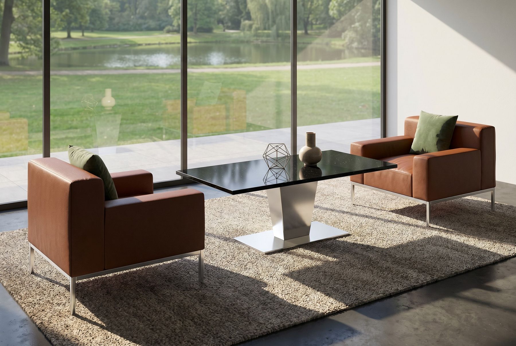 Der Couchtisch Toronto aus Naturstein und Metall vereint klare Linien, hochwertige Materialien und handwerkliche Fertigung zu einem modernen Wohnzimmertisch. Die massive Tischplatte aus Naturstein trifft auf ein präzise gefertigtes Gestell aus Stahl oder Edelstahl und sorgt für eine stabile und langlebige Konstruktion.