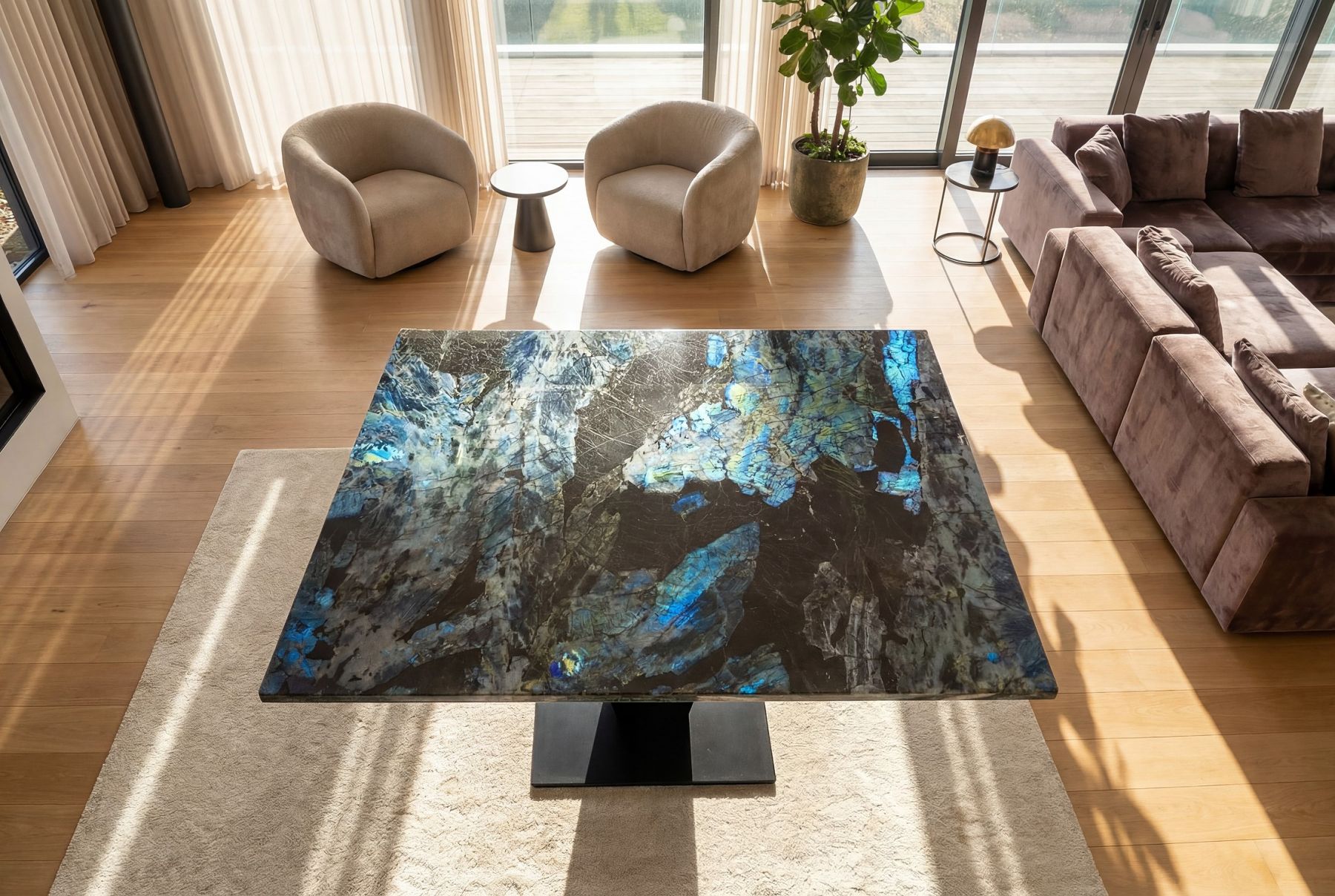 Natursteinplatten sind sehr belastbar. In Kombination mit Metall oder Massivholz entsteht ein stabiler und langlebiger Tisch.