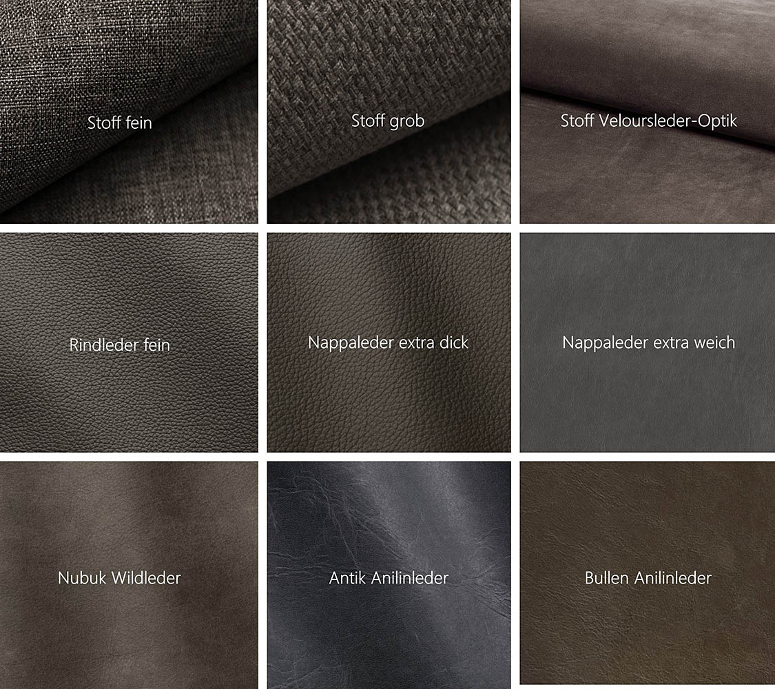 Damit Sie sich vor dem Kauf von der Qualität und den Farben unserer Leder- und Stoffvarianten überzeugen können, bieten wir Ihnen einen kostenlosen Musterversand an. Bestellen Sie Ihre Wunschmuster bequem nach Hause und prüfen Sie Optik sowie Haptik in Ihrem eigenen Wohnambiente.