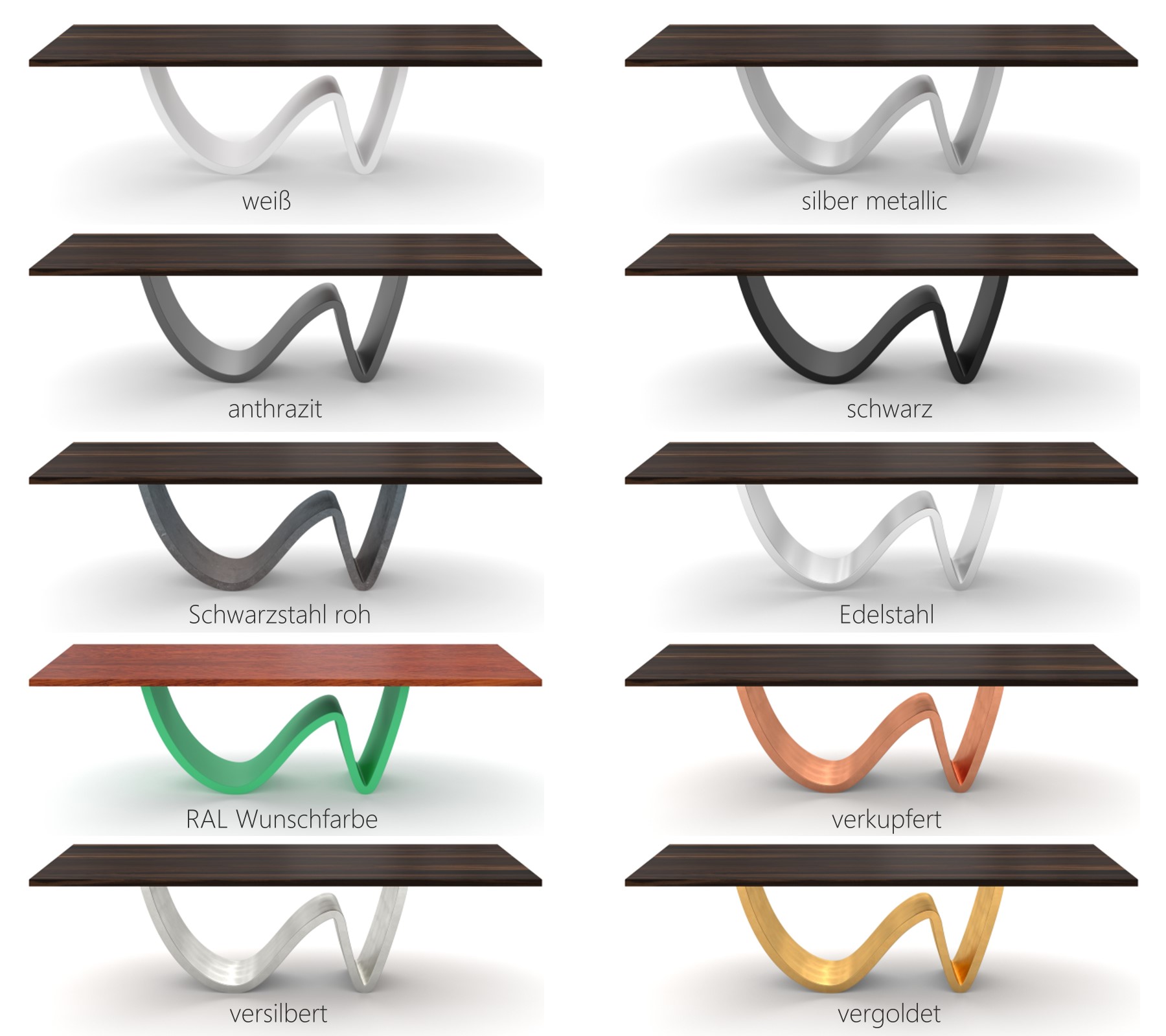 Beim Tischgestell können Sie zwischen Edelstahl gebürstet oder Stahl auswählen. Der Stahl kann dann eine farbliche Lackierung erhalten oder raffiniert mit Blattgold, Blattsilber oder Blattkupfer veredelt werden.