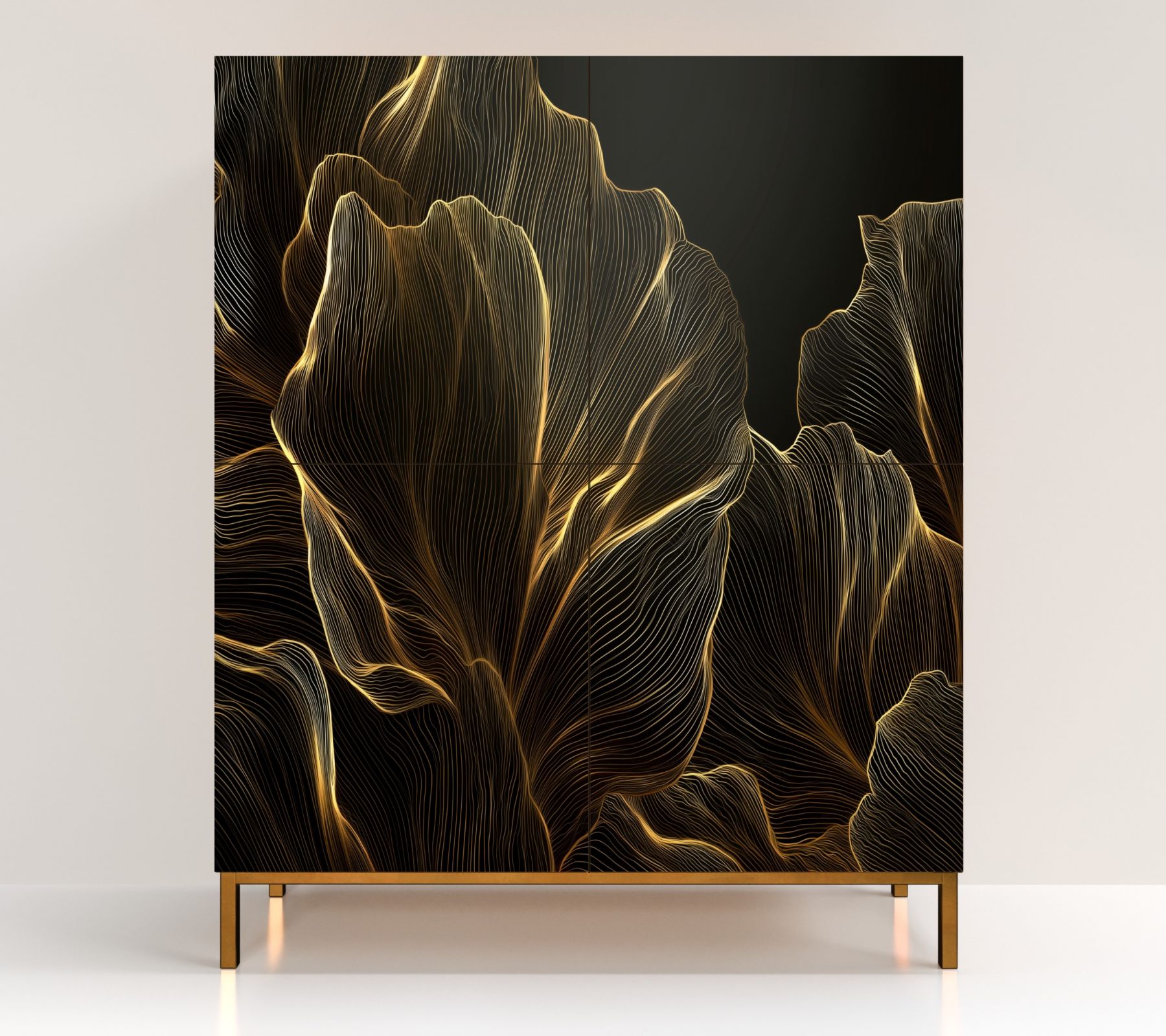 Dieses Highboard mit dem eindrucksvollen Motiv „blach&gold“ überzeugt durch eine naturgetreue Darstellung und eine kraftvolle Präsenz. Ob als Kleiderschrank im Kinderzimmer oder als stilvolles Sideboard im Schlafzimmer – dieses nach Maß konfigurierbare Möbelstück ist ein echtes Statement mit Charakter.