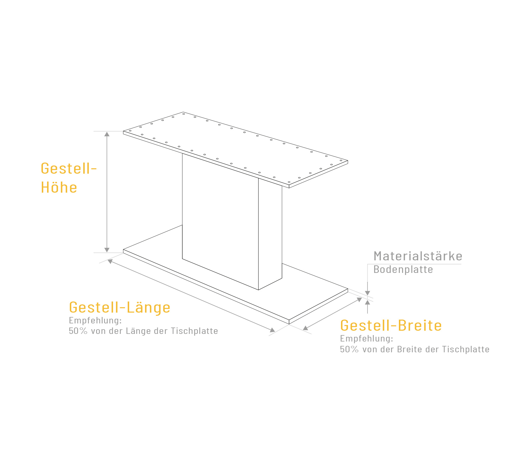 Um die richtige Höhe des Tischgestells zu bestimmen, zieht man im Normalfall die Stärke der Tischplatte von der gewünschten Höhe des Tisches ab.