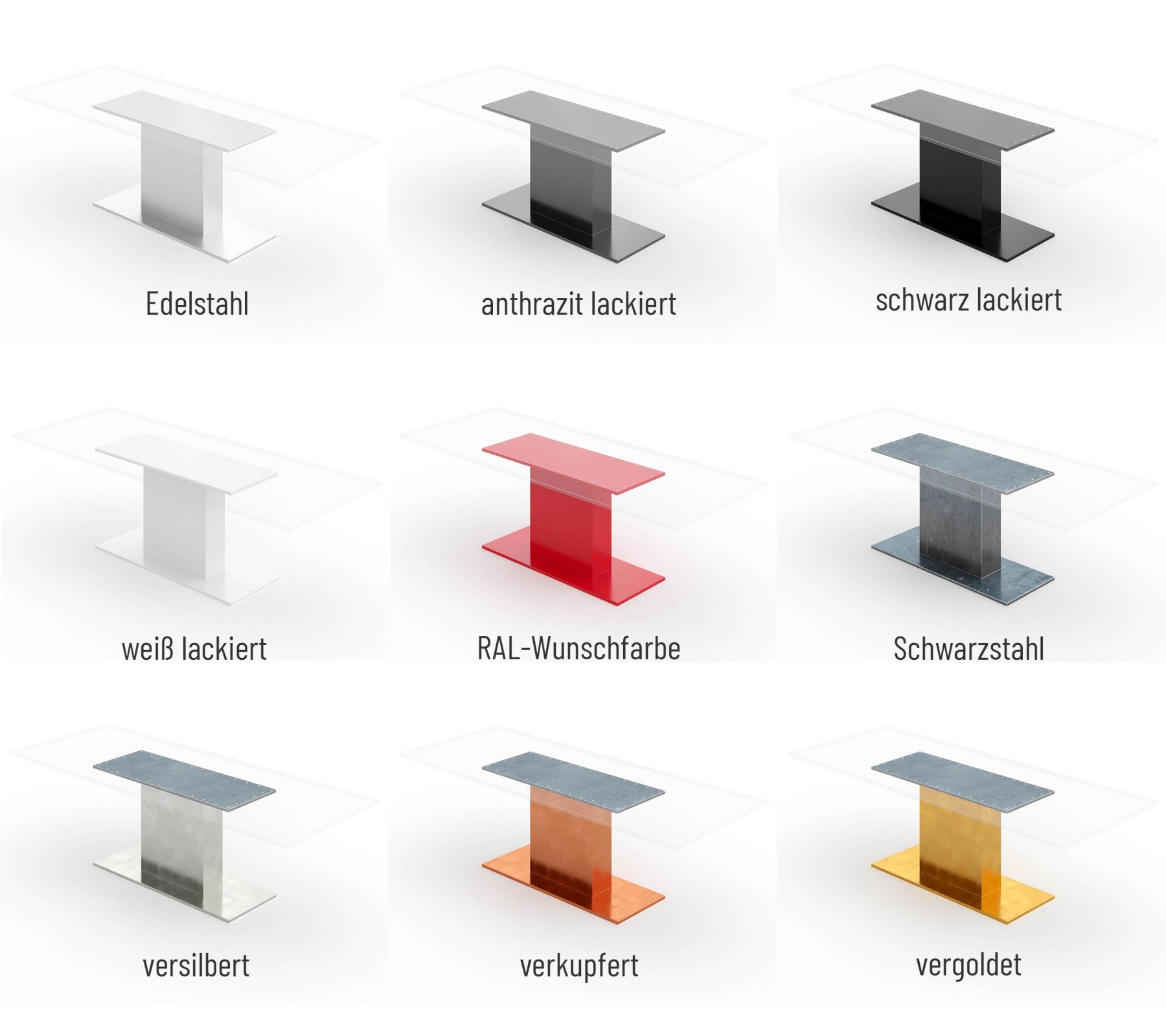 Dieses hochwertige Tischgestell kann für unterschiedliche Arten von Tischplatten verwendet werden. Für unsere Produktion ist entscheidend, welche Tischplatte auf dem Gestell angebracht werden soll. Bitte teilen Sie uns während des Bestellvorgangs im Bemerkungsfeld mit, ob die Platte aus Holz, Stein oder Glas ist. Unser Kundenservice kontaktiert Sie anschließend, um Fragen zur Statik oder Befestigung mit Ihnen zu besprechen. Das Untergestell wird dann mit der passenden Befestigung angefertigt. Konfigurieren Sie sich Ihren Tisch - einzigartig, individuell direkt in unserer Manufaktur erschaffen. Eine große Auswahl an maßgefertigten Tischplatten oder exklusiven Baumscheiben finden Sie außerdem in unserem Shop. Des Weiteren bieten wir natürlich auch komplette Esstische und Couchtische nach Maß an.