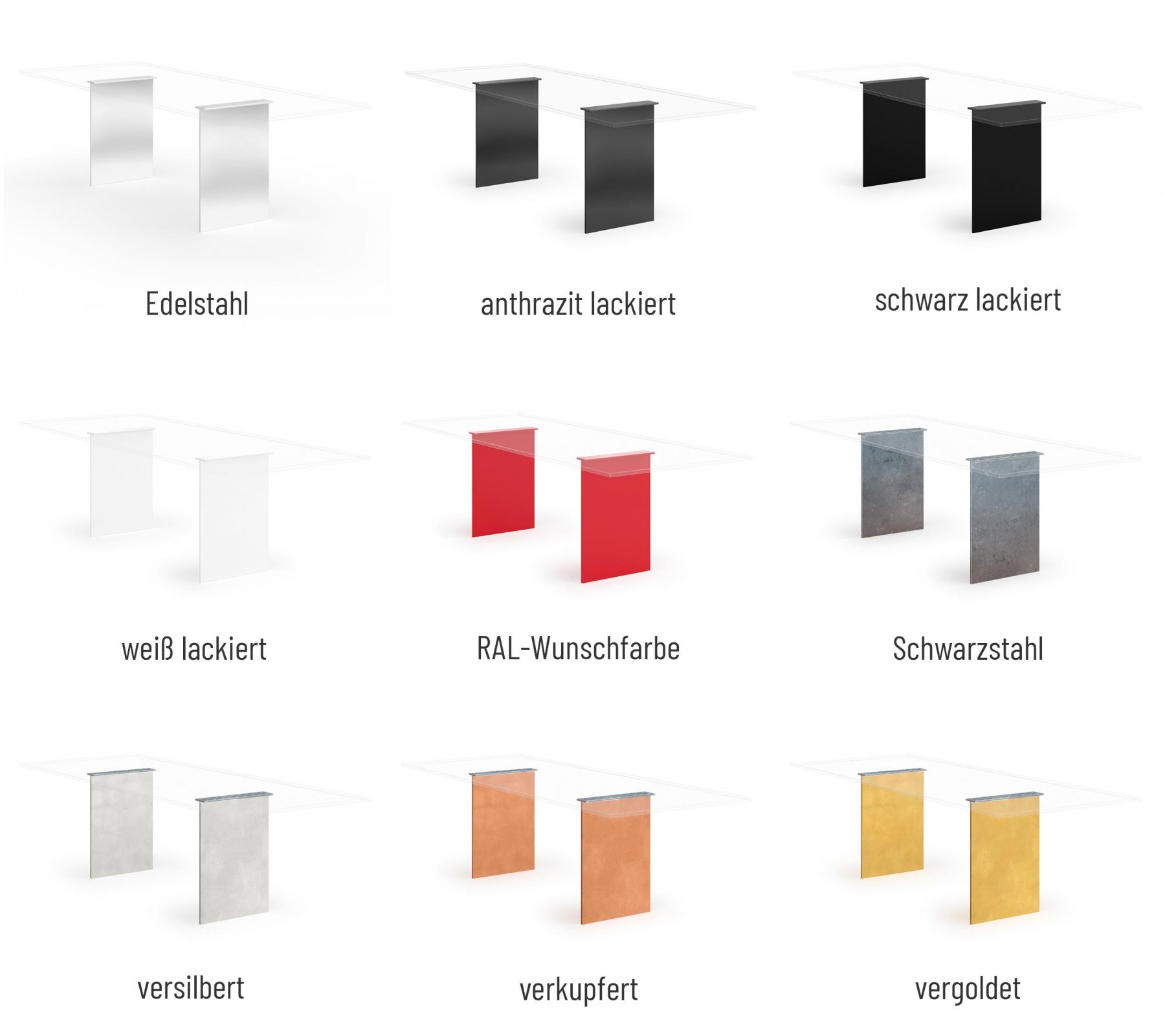 Das Tischgestell "Genf" besteht aus 2 Tischwangen aus Schwarzstahl, Edelstahl oder in Ihrer Wunschfarbe lackiert, ist mit seiner puristischen Form ein echter Blickfang. Die starke und stabile Optik ist ideal für Liebhaber des modernen Designs. Durch Charakter und Klasse wird dieser Tisch jeden beeindrucken. Beim Entwerfen haben wir auf unnötige Schnörkel verzichtet und uns auf geradlinige Formen der Tischkufen konzentriert. In Kombination mit einer Tischplatte aus Massivholz wird es zum Blickfang in Ihrem Wohnbereich. Das designte Stahl- bzw. Metallgestell können Sie ganz nach Ihren Wünschen nach Maß konfigurieren. Sofern Sie eine Tischplatte aus Glas oder Stein auflegen möchten, kontaktieren Sie bitte vorab unseren Kundenservice.