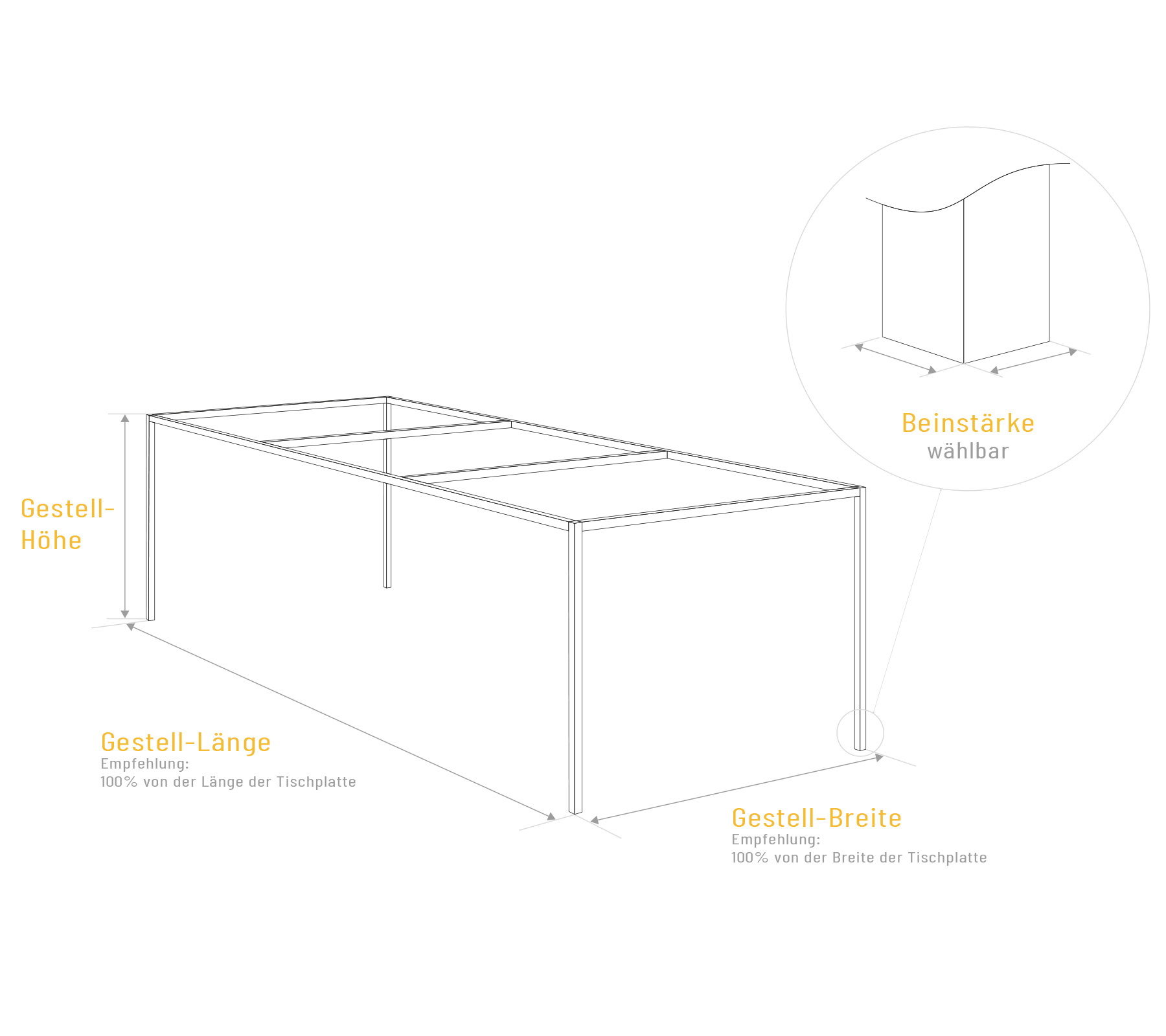 Filigran designt und nach Maß gefertigt - unser modernes Tischgestell Berlin. Nach wie vor eines der Lieblinge unserer Kunden. Die Vorteile liegen auf der Hand - dezent, zeitlos, stabil und für jede Art von Tischplatte geeignet. Es eignet sich optimal für den minimalistischen Einrichtungsstil. Der grazile Rahmen bietet große Formstabilität bei geringem Platzverbrauch und gliedert sich dadurch dezent in Ihrem Wohnumfeld ein. Ganz klassisch mit einer Holzplatte oder auch in Kombination mit Glas, schaffen Sie sich eine einzigartige Atmosphäre. Mit dem Konfigurator können Sie das gewünschte Material oder die Veredelung des Tischgestells auswählen. Sie können die Beinstärke bei dem Metallgestell selbst wählen. Wir empfehlen ab einer Tischfläche größer 1,5 qm mindestens 3 x 3 cm und größer 2,5 qm mindestens 4 x 4 cm Profilstärke.