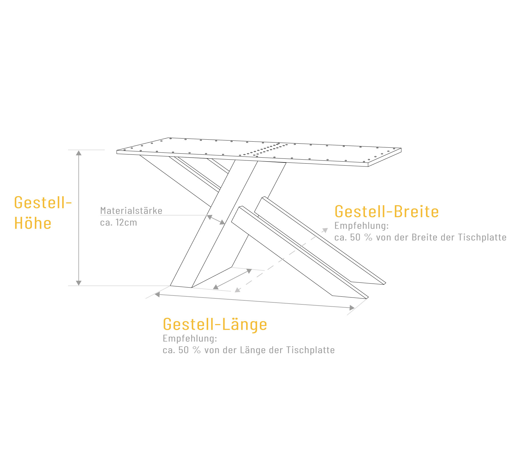 - Breite Gestell: von 30 bis 150 cm (mindestens Tischplattenbreite x 0,6 )