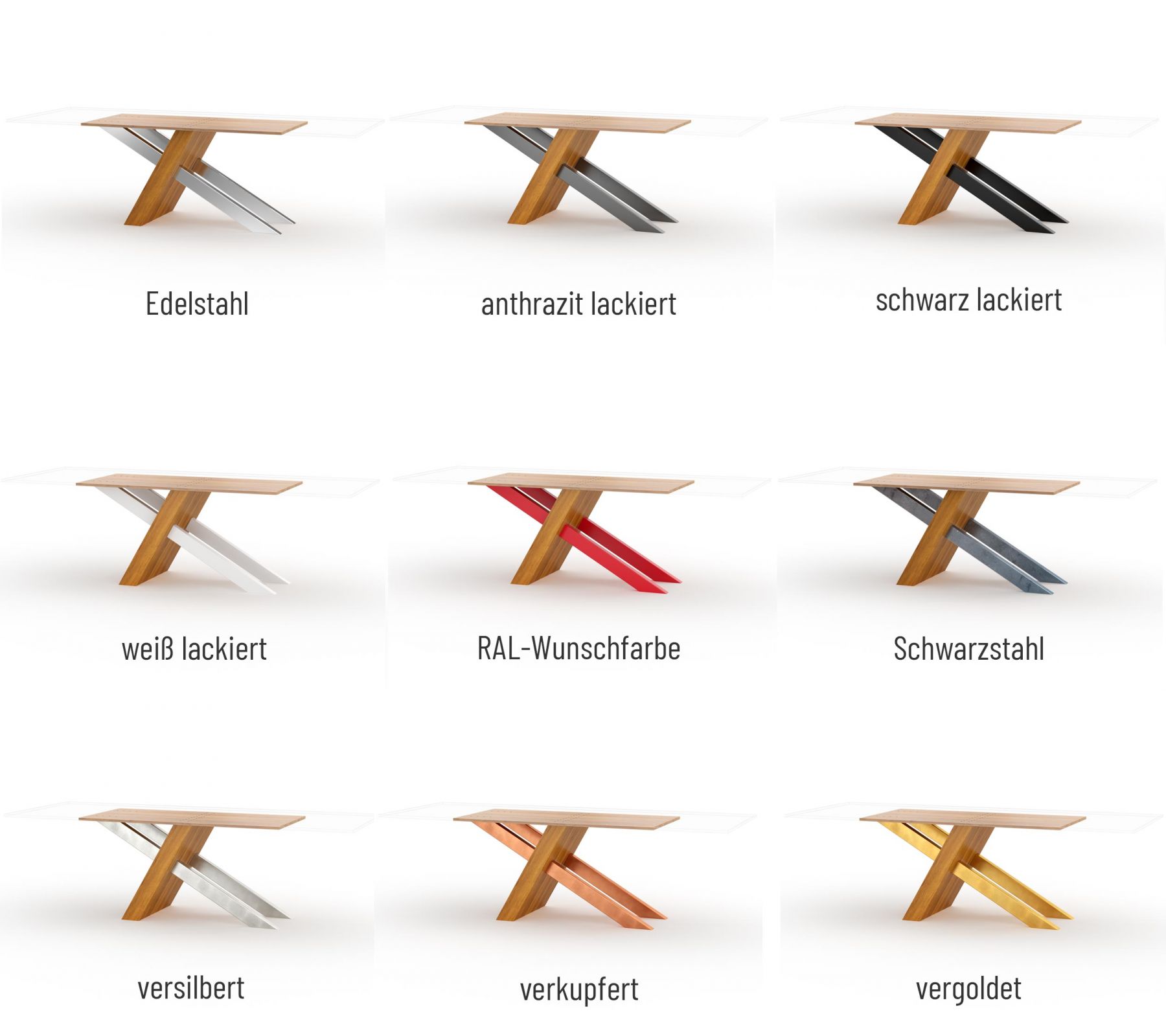 Das Tischgestell Lima vereint Massivholz und Metall zu einer einzigartigen Form. Damit holen Sie sich das ganz besondere Wohngefühl nach Hause. Das Massivholz in diagonal gekippter Optik in Verbindung mit Stahl verleiht Ihrem Interieur das gewisse Etwas. Durch die besonders stabile Konstruktion eignet sich Lima für jegliche Arten von Tischplatten. Für eine gelungene Optik sorgt der patente Materialmix des Tischgestells. Wir bieten Ihnen viele verschiedene Oberflächenfarben zur Auswahl, womit Sie das Gestell farblich Ihrer Tischplatte anpassen können. Für zahlreiche Gestaltungsmöglichkeiten können Sie die Länge, Breite und Höhe frei wählen.