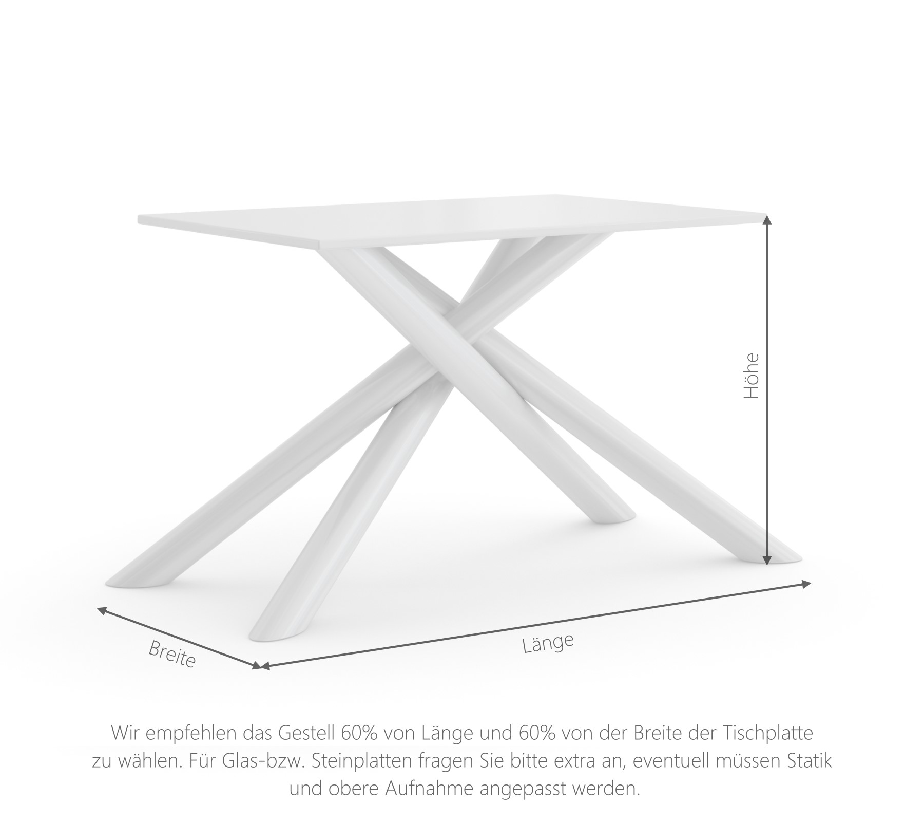 Das hochwertige Tischgestell ist vorzugsweise für eine Tischplatte aus Holz geeignet. Für Tischplatten aus Glas, Stein oder Keramik kontaktieren Sie bitte vor der Bestellung unseren Kundenservice für ein individuelles Angebot. Bitte teilen Sie uns während des Bestellvorgangs im Bemerkungsfeld mit, welche Maße Ihre aufzulegende Tischplatte hat. Unser Kundenservice kontaktiert Sie anschließend, um Fragen zur Statik oder Befestigung mit Ihnen zu besprechen. Konfigurieren Sie sich Ihren Tisch - einzigartig, individuell direkt in unserer Manufaktur erschaffen. Eine große Auswahl an maßgefertigten Tischplatten oder exklusiven Baumscheiben finden Sie außerdem in unserem Shop. Des Weiteren bieten wir natürlich auch komplette Esstische und Couchtische nach Maß an.