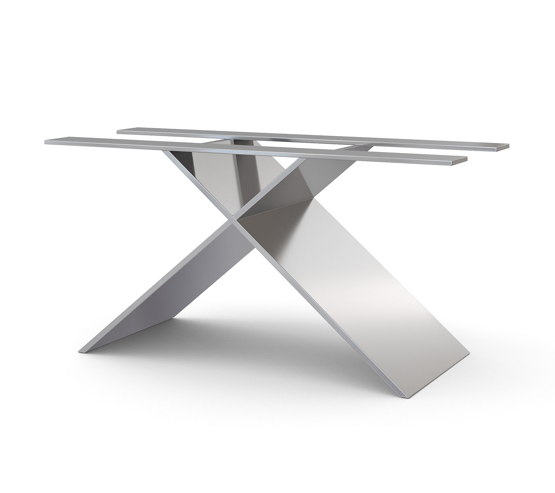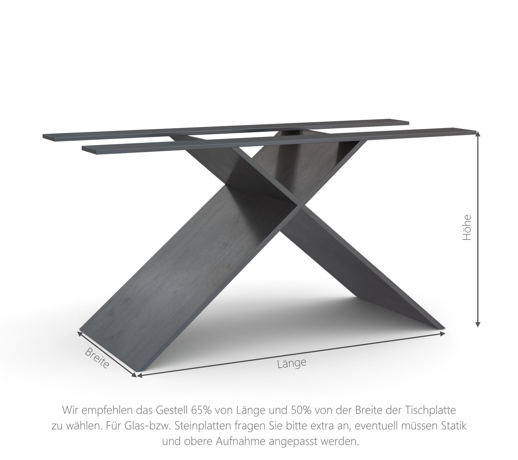 Das hochwertige Tischgestell ist vorzugsweise für eine Tischplatte aus Holz geeignet. Für Tischplatten aus Glas, Stein oder Keramik kontaktieren Sie bitte vor der Bestellung unseren Kundenservice für ein individuelles Angebot. Bitte teilen Sie uns während des Bestellvorgangs im Bemerkungsfeld mit, welche Maße Ihre aufzulegende Tischplatte hat. Unser Kundenservice kontaktiert Sie anschließend, um Fragen zur Statik oder Befestigung mit Ihnen zu besprechen. Konfigurieren Sie sich Ihren Tisch - einzigartig, individuell direkt in unserer Manufaktur erschaffen. Eine große Auswahl an maßgefertigten Tischplatten oder exklusiven Baumscheiben finden Sie außerdem in unserem Shop. Des Weiteren bieten wir natürlich auch komplette Esstische und Couchtische nach Maß an.