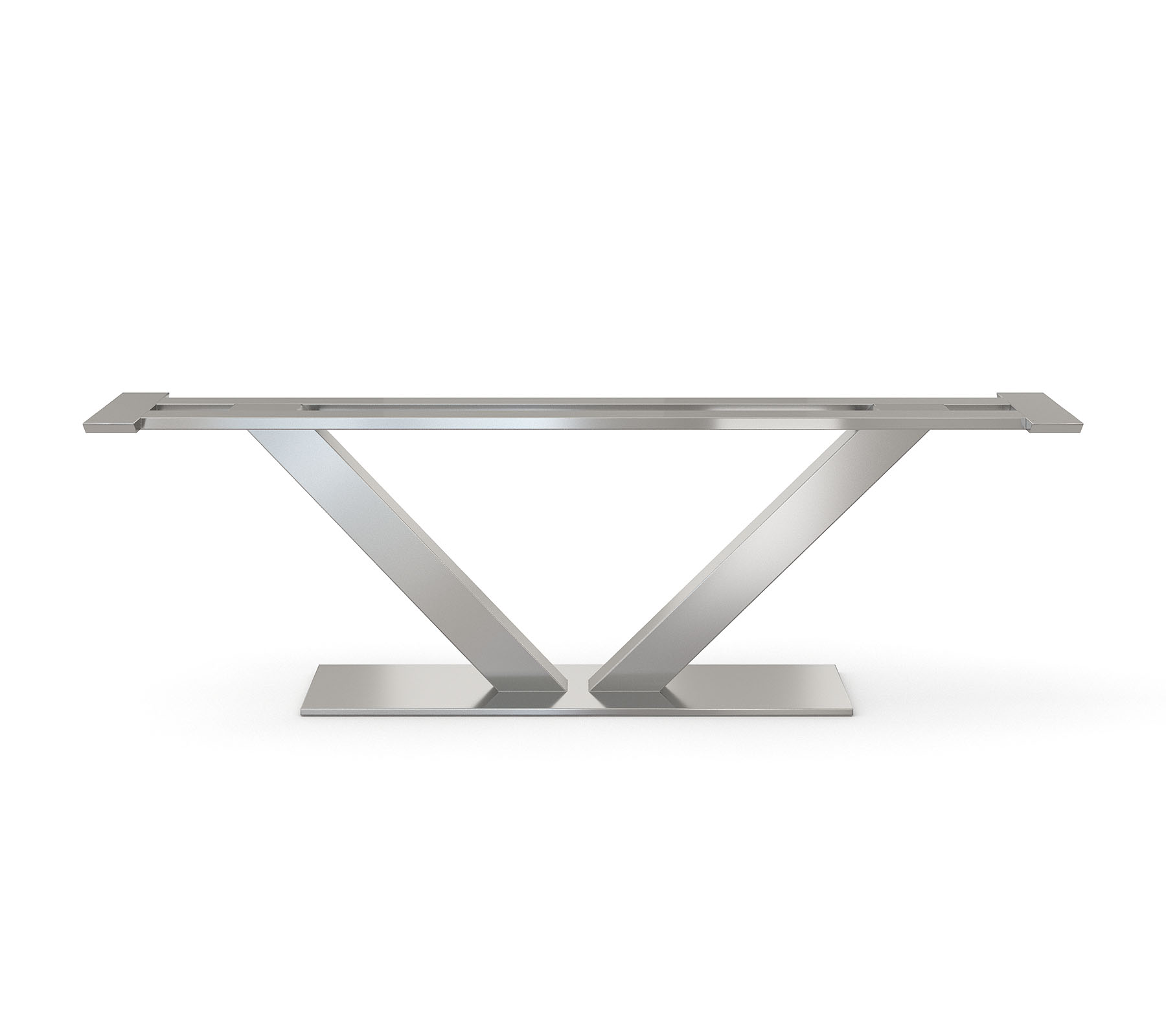 Funktionalität und modernes Design stehen bei dem Tischgestell Stettin aus massivem Metall im Vordergrund. Das puristische Esstisch-Untergestell kommt ohne große Designelemente aus und beeindruckt allein durch die kraftvolle Ausstrahlung der beiden V-förmig angeordneten Metallstreben. In Verbindung mit einer schönen Tischplatte aus natürlichem Holz, Naturstein oder Epoxidharz erhalten Sie einen Esstisch, der durch Individualität und eine präzise Linienführung überzeugt.