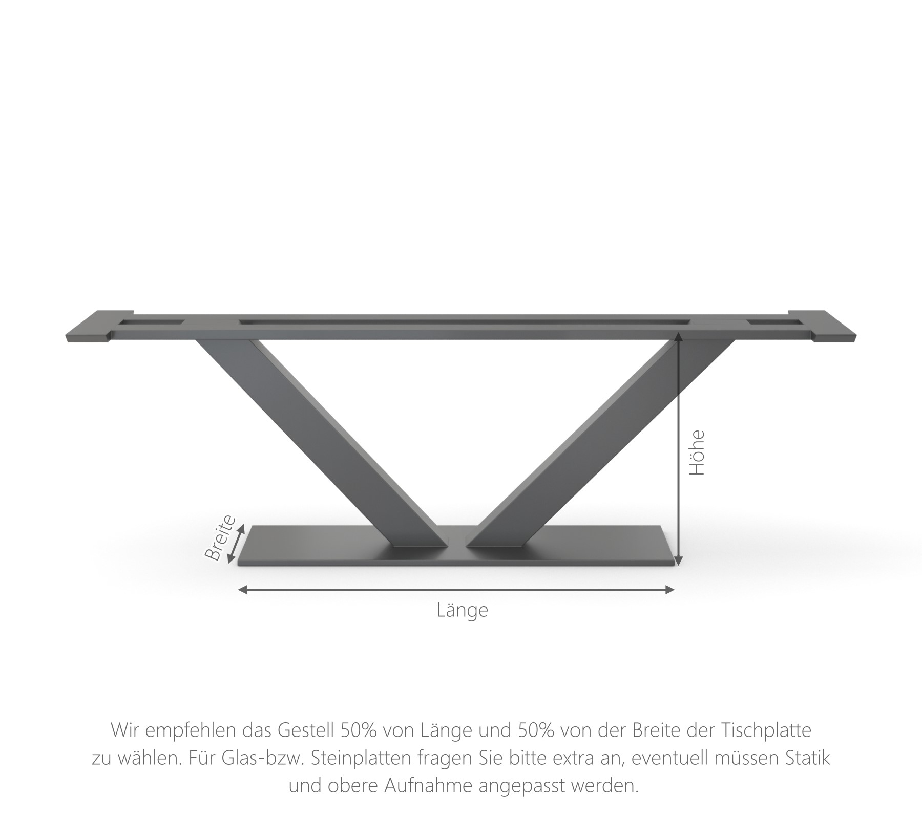 Das hochwertige Tischgestell ist vorzugsweise für eine Tischplatte aus Holz geeignet. Für Tischplatten aus Glas, Stein oder Keramik kontaktieren Sie bitte vor der Bestellung unseren Kundenservice für ein individuelles Angebot. Bitte teilen Sie uns während des Bestellvorgangs im Bemerkungsfeld mit, welche Maße Ihre aufzulegende Tischplatte hat. Unser Kundenservice kontaktiert Sie anschließend, um Fragen zur Statik oder Befestigung mit Ihnen zu besprechen. Konfigurieren Sie sich Ihren Tisch - einzigartig, individuell direkt in unserer Manufaktur erschaffen. Eine große Auswahl an maßgefertigten Tischplatten oder exklusiven Baumscheiben finden Sie außerdem in unserem Shop. Des Weiteren bieten wir natürlich auch komplette Esstische und Couchtische nach Maß an.