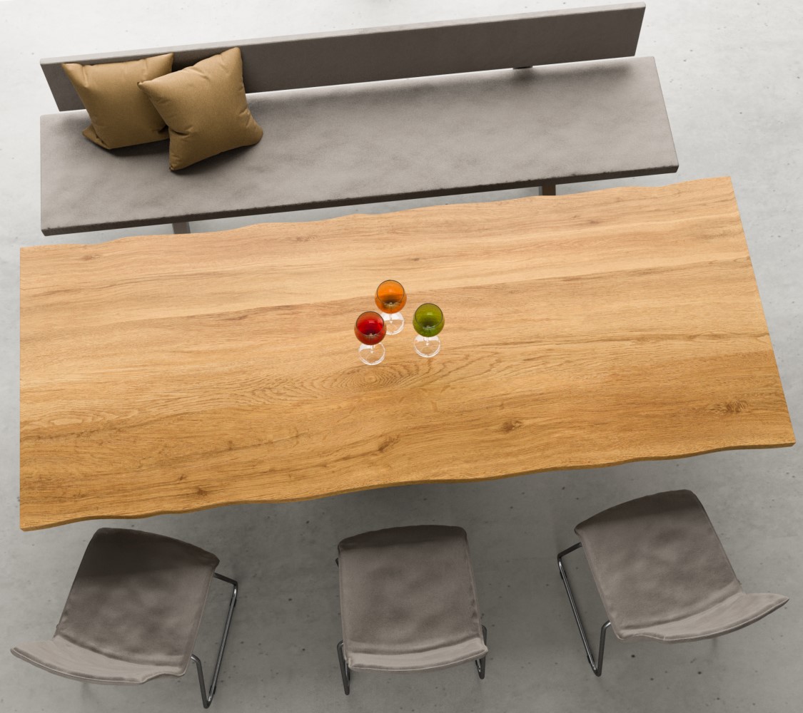 Natürlicher kann eine Tischplatte mit Baumkante nicht sein. Die Baumkante macht jedes Exemplar einzigartig in Form und Maserung, so wie jeder Baum einzigartig ist. Farbnuancen und Form des Baumkantentisches sind vom naturgegebenen Wuchs sowie Holzmaserung geprägt. Die Tischplatte zeigt die außerordentliche Handwerkskunst unserer Schreinermeister. Das einzigartige und natürliche Erscheinungsbild macht Ihren maßgefertigten Tisch zum Mittelpunkt Ihres Wohninterieurs. Ein exklusiver Eyecatcher, der sich in jeden Wohnstil integrieren lässt. Die Unikat-Tischplatte überzeugt im natürlichen Design und lässt sich ganz individuell mit Stühlen oder Bänken kombinieren.