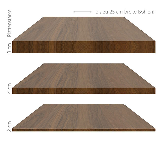 Die handgefertigte Holzplatte können Sie individuell als Esstischplatte, Couchtischplatte, Arbeitsplatte oder auch als Schreibtischplatte verwenden. Bitte beachten Sie, dass bei der Auswahl der Tischplattenstärke die statische Belastbarkeit in Bezug auf Größe bzw. die geplante Nutzung zum vorgesehenen Gestell berücksichtigt werden müssen. Bitte stellen Sie sicher, dass Sie die erforderlichen statischen Berechnungen oder Überprüfungen vornehmen, bevor Sie eine Bestellung aufgeben. Gern beraten wir Sie dazu auch telefonisch. Wählen Sie aus 40 verschiedenen Hölzern ihr passendes Design und konfigurieren Sie Ihre Platte in den gewünschten Maßen. Die Massivholzplatte ist in unterschiedlichen Stärken und Oberflächenbearbeitungen erhältlich. Die Bohlen sind je nach Holzsorte 10 bis 25 cm breit. Dadurch behält die Holzmaserung ihre natürliche Optik und kommt in voller Breite zur Wirkung. Abgerundet wird das Erscheinungsbild durch die Wahl Ihrer Holzversiegelung. Treffen Sie Ihre Entscheidung zwischen geölt, gewachst oder auch lackiert für einen geringeren Pflegeaufwand der Holzoberfläche.