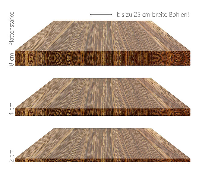 Die handgefertigte Holzplatte können Sie individuell als Esstischplatte, Couchtischplatte, Arbeitsplatte oder auch als Schreibtischplatte verwenden. Bitte beachten Sie, dass bei der Auswahl der Tischplattenstärke die statische Belastbarkeit in Bezug auf Größe bzw. die geplante Nutzung zum vorgesehenen Gestell berücksichtigt werden müssen. Bitte stellen Sie sicher, dass Sie die erforderlichen statischen Berechnungen oder Überprüfungen vornehmen, bevor Sie eine Bestellung aufgeben. Gern beraten wir Sie dazu auch telefonisch. Wählen Sie aus 40 verschiedenen Hölzern ihr passendes Design und konfigurieren Sie Ihre Platte in den gewünschten Maßen. Die Massivholzplatte ist in unterschiedlichen Stärken und Oberflächenbearbeitungen erhältlich. Die Bohlen sind je nach Holzsorte 10 bis 25 cm breit. Dadurch behält die Holzmaserung ihre natürliche Optik und kommt in voller Breite zur Wirkung. Abgerundet wird das Erscheinungsbild durch die Wahl Ihrer Holzversiegelung. Treffen Sie Ihre Entscheidung zwischen geölt, gewachst oder auch lackiert für einen geringeren Pflegeaufwand der Holzoberfläche.