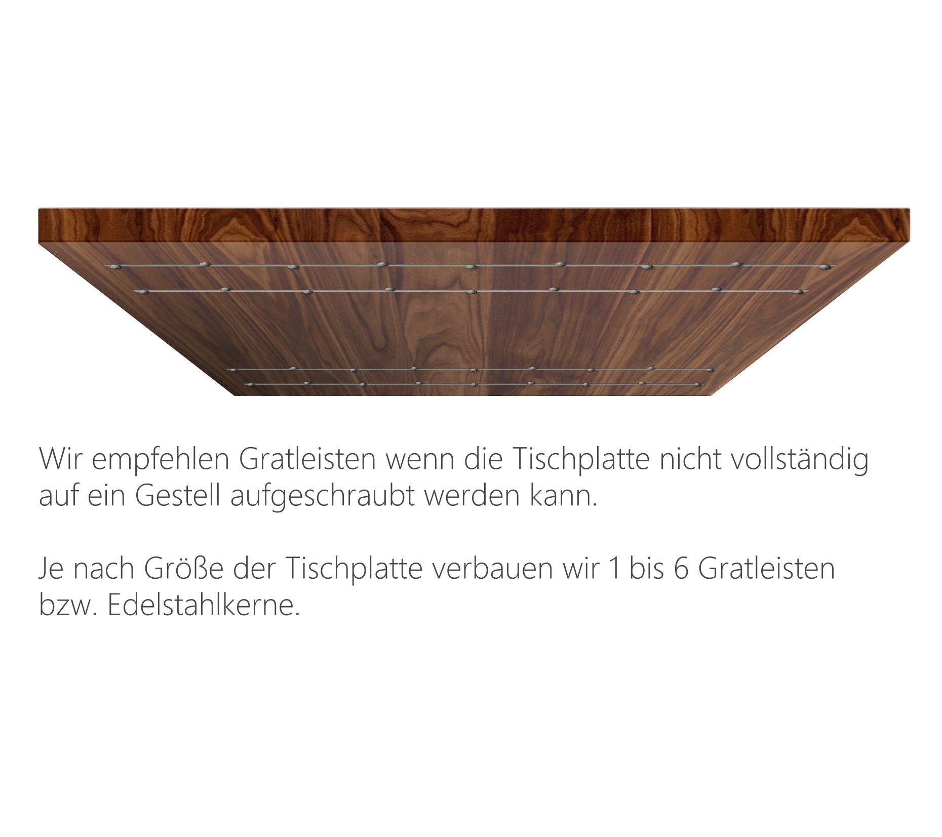 Konfigurieren Sie Ihre Massivholzplatte in unterschiedlichen Oberflächenbearbeitungen und Stärken. Die Holzbohlen sind je nach Holzsorte 10 bis 25 cm breit. Bitte beachten Sie, dass bei der Auswahl der Tischplattenstärke die statische Belastbarkeit in Bezug auf Größe bzw. die geplante Nutzung zum vorgesehenen Gestell berücksichtigt werden müssen. Bitte stellen Sie sicher, dass Sie die erforderlichen statischen Berechnungen oder Überprüfungen vornehmen, bevor Sie eine Bestellung aufgeben. Gern beraten wir Sie dazu auch telefonisch. Dies sorgt für eine natürliche Optik der Holzmaserung und kommt in voller Breite zur Wirkung. Das Erscheinungsbild wird durch die Holzversiegelung vollendet. Wählen Sie zwischen der Oberflächenveredelung gewachst, geölt oder lackiert.