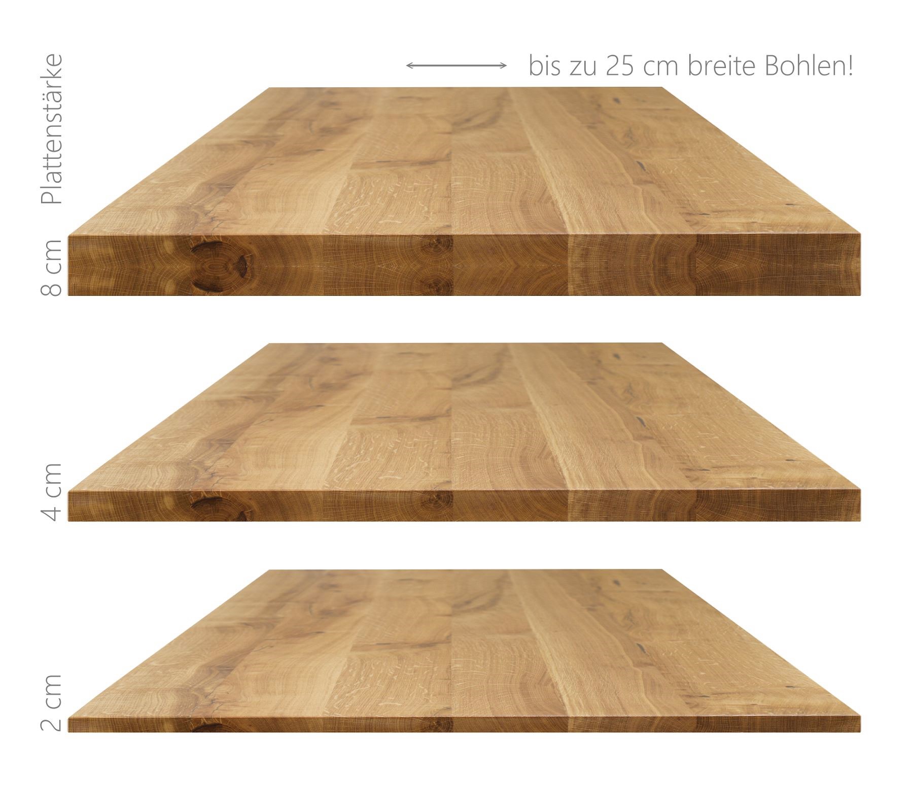 Konfigurieren Sie Ihre Massivholzplatte in unterschiedlichen Oberflächenbearbeitungen und Stärken. Die Holzbohlen sind je nach Holzsorte 10 bis 25 cm breit. Bitte beachten Sie, dass bei der Auswahl der Tischplattenstärke die statische Belastbarkeit in Bezug auf Größe bzw. die geplante Nutzung zum vorgesehenen Gestell berücksichtigt werden müssen. Bitte stellen Sie sicher, dass Sie die erforderlichen statischen Berechnungen oder Überprüfungen vornehmen, bevor Sie eine Bestellung aufgeben. Gern beraten wir Sie dazu auch telefonisch. Dies sorgt für eine natürliche Optik der Holzmaserung und kommt in voller Breite zur Wirkung. Das Erscheinungsbild wird durch die Holzversiegelung vollendet. Wählen Sie zwischen der Oberflächenveredelung gewachst, geölt oder lackiert.
