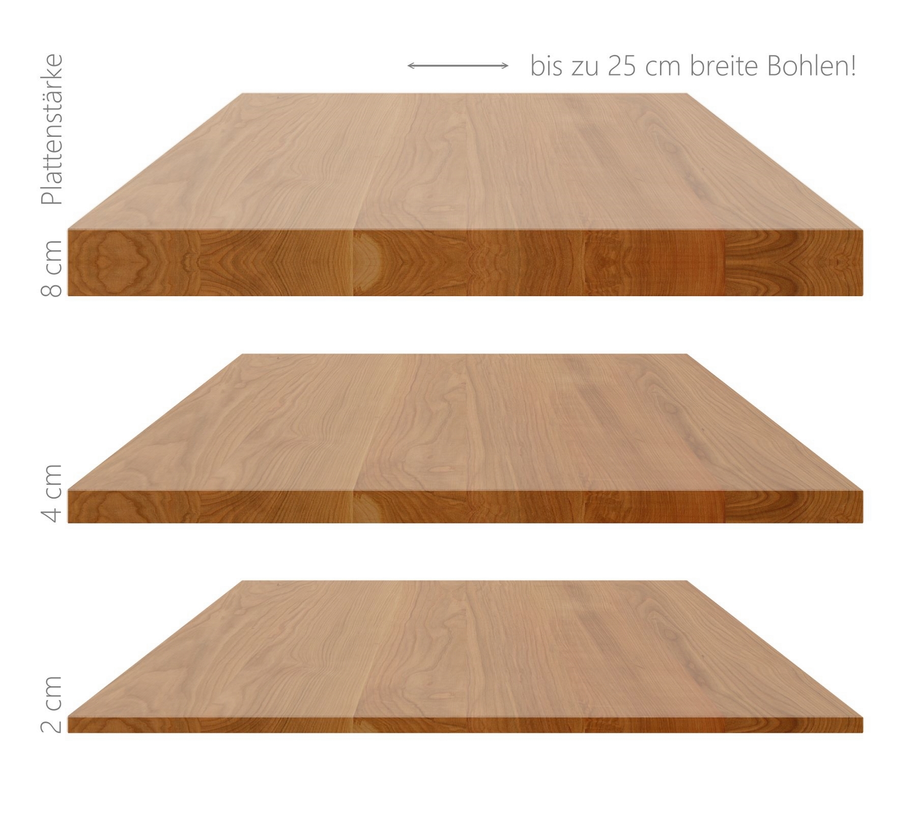 Konfigurieren Sie Ihre Tischplatte aus 40 verschiedenen Hölzern mit Ihren gewünschten Maßen. Bitte beachten Sie, dass bei der Auswahl der Tischplattenstärke die statische Belastbarkeit in Bezug auf Größe bzw. die geplante Nutzung zum vorgesehenen Gestell berücksichtigt werden müssen. Bitte stellen Sie sicher, dass Sie die erforderlichen statischen Berechnungen oder Überprüfungen vornehmen, bevor Sie eine Bestellung aufgeben. Gern beraten wir Sie dazu auch telefonisch. Die Bohlen sind je nach Holzsorte 10 bis 25 cm breit. Die Holzmaserung behält dadurch ihre natürliche Optik und kommt in voller Breite zur Wirkung. Abgerundet wird das Erscheinungsbild durch die Wahl Ihrer Holzversiegelung. Treffen Sie Ihre Entscheidung zwischen geölt, gewachst oder auch lackiert für einen geringeren Pflegeaufwand der Holzoberfläche.
